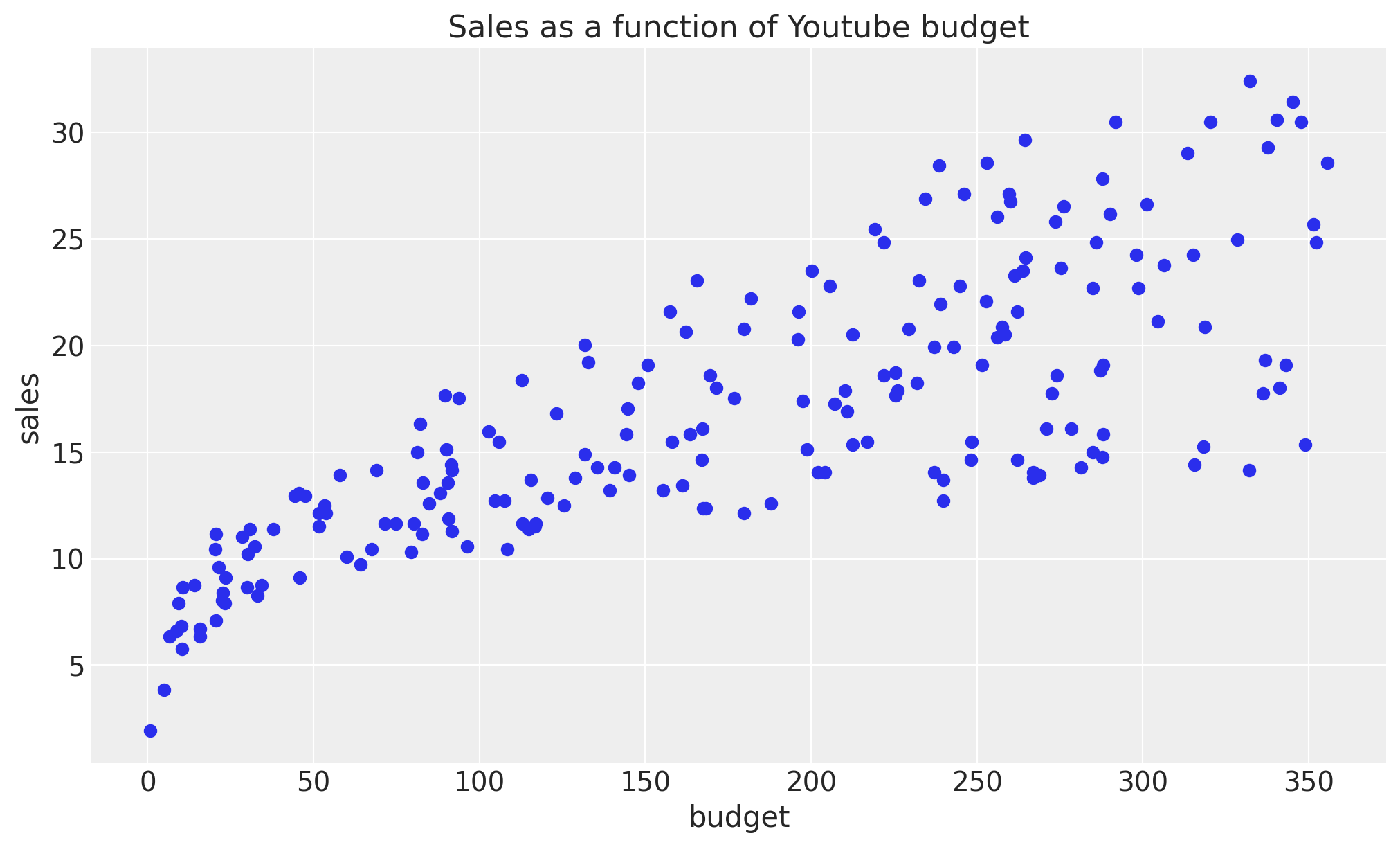 ax.plot(df["youtube"], df["sales"], "o", c="C0", label="Raw Data")