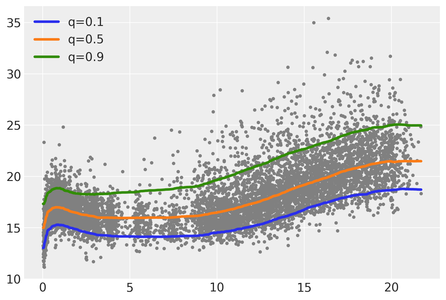 To better understand these remarks let’s compute a BART regression with a Normal likelihood and then compute the same 3 quantiles from that fit.