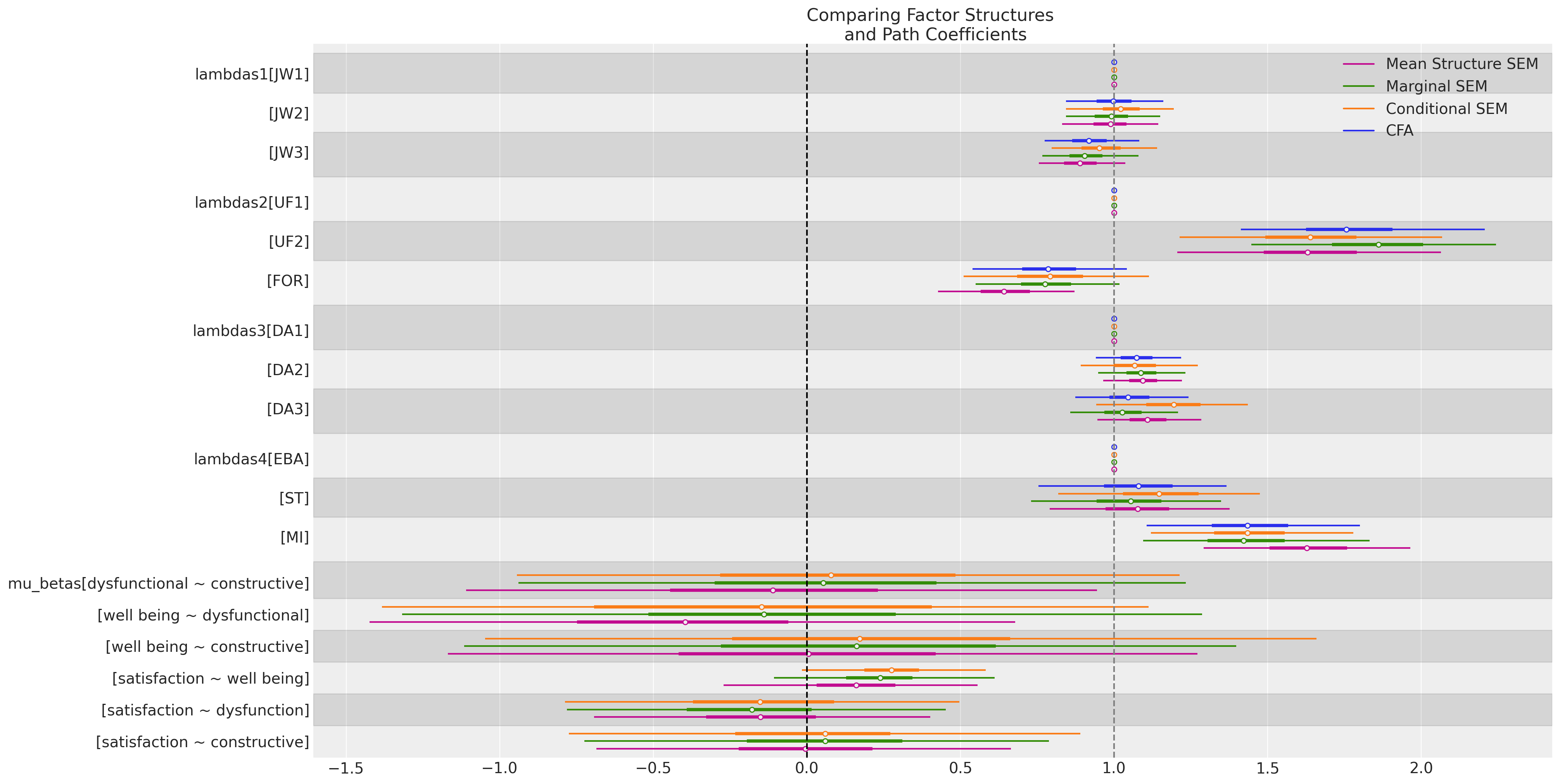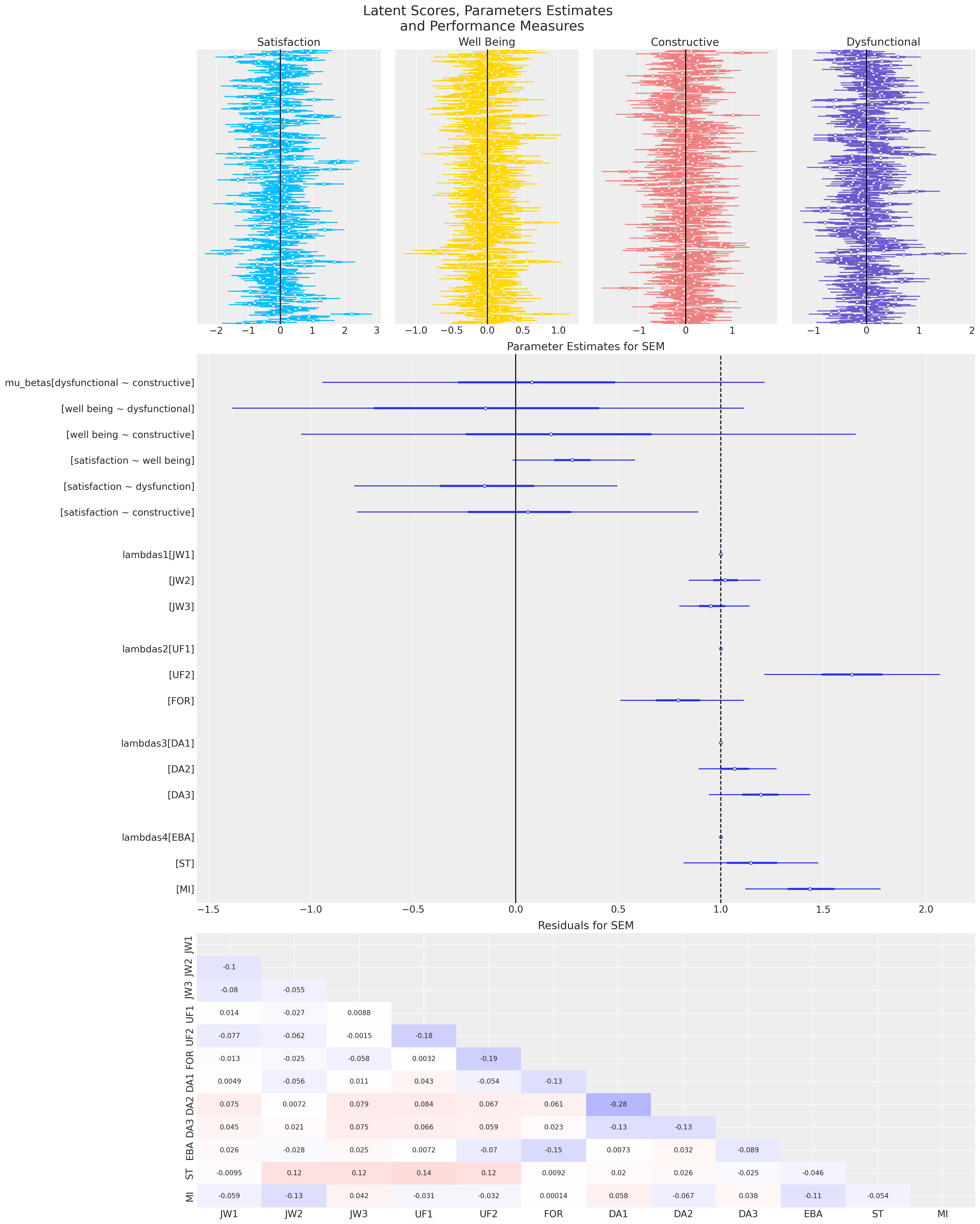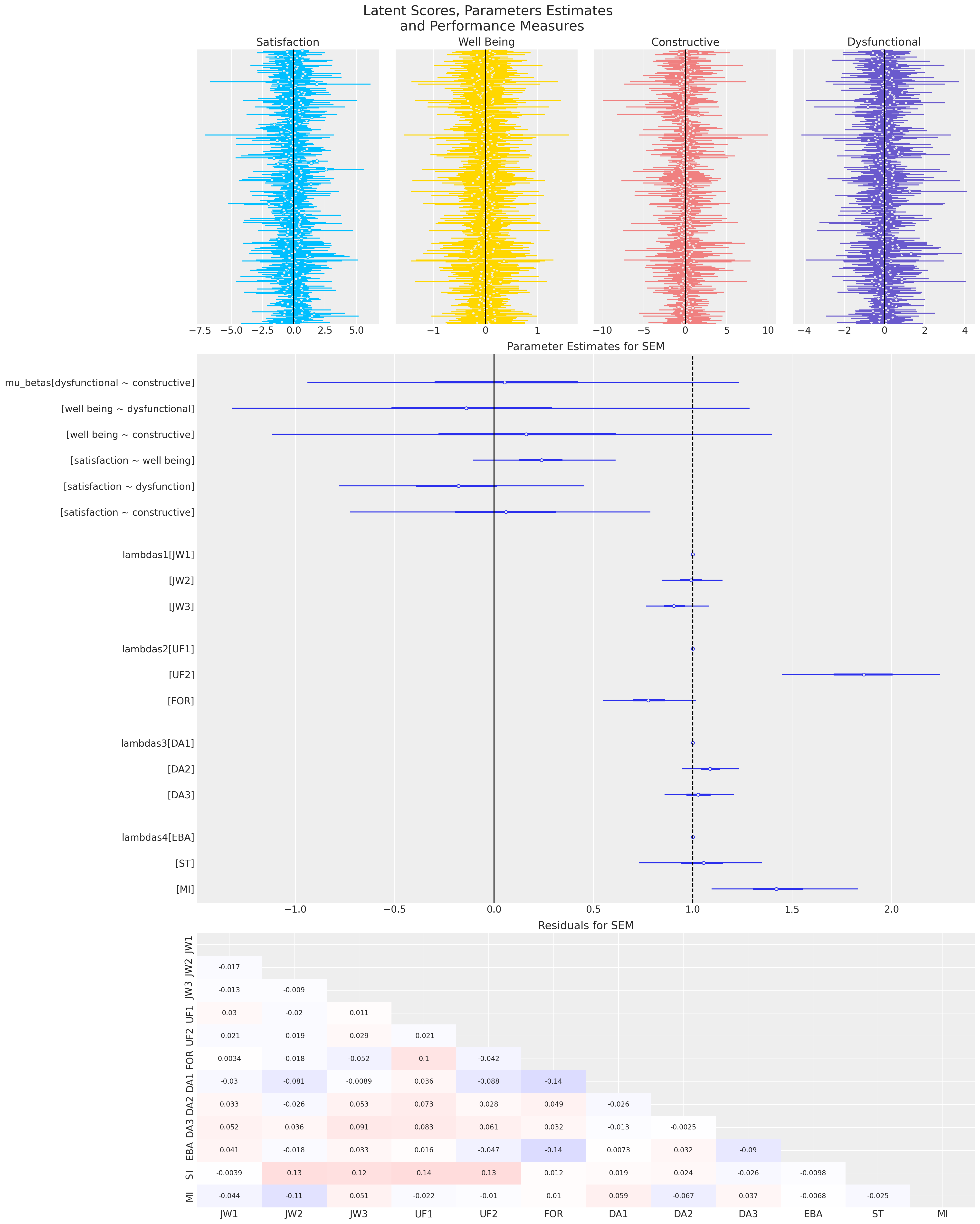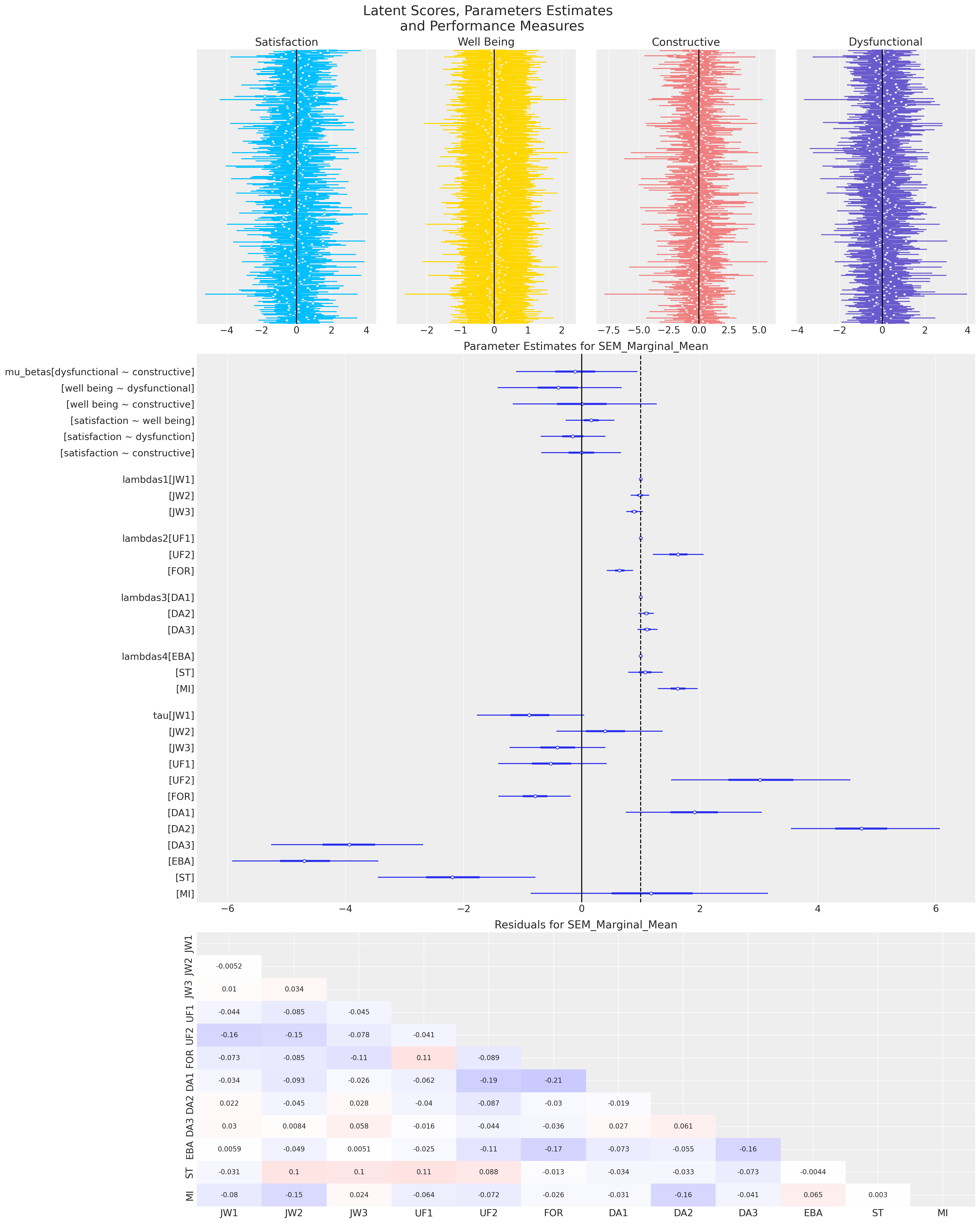 We have now seen how to articulate Structural Equation models and their variants in PyMC. The SEM workflow is, at heart, Bayesian in temperament. Hypothesise and construct. Construct then Estimate. Estimate and check. Check then refine. Refine then expand… Both disciplines reject the checklist mentality of “fit once, report, move on.” Instead, they cultivate a focused, deliberate practice. Each demands an apprenticeship in which skill is honed: skill to see how assumptions shape understanding, and how the world resists the imposition of false structures. Skill to find the right structures. Each iteration is a dialogue between theory and evidence. At each juncture we ask whether this model speaks true? Whether this structure reflects the facts to hand?