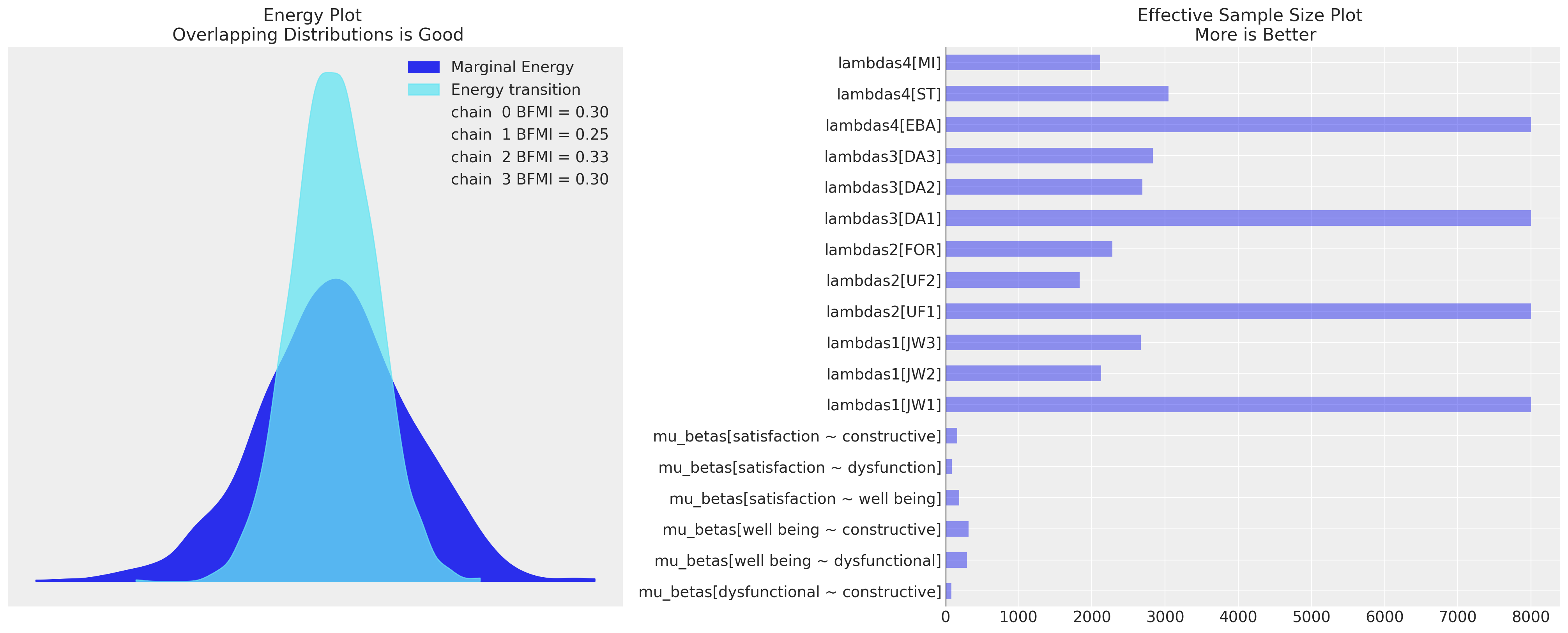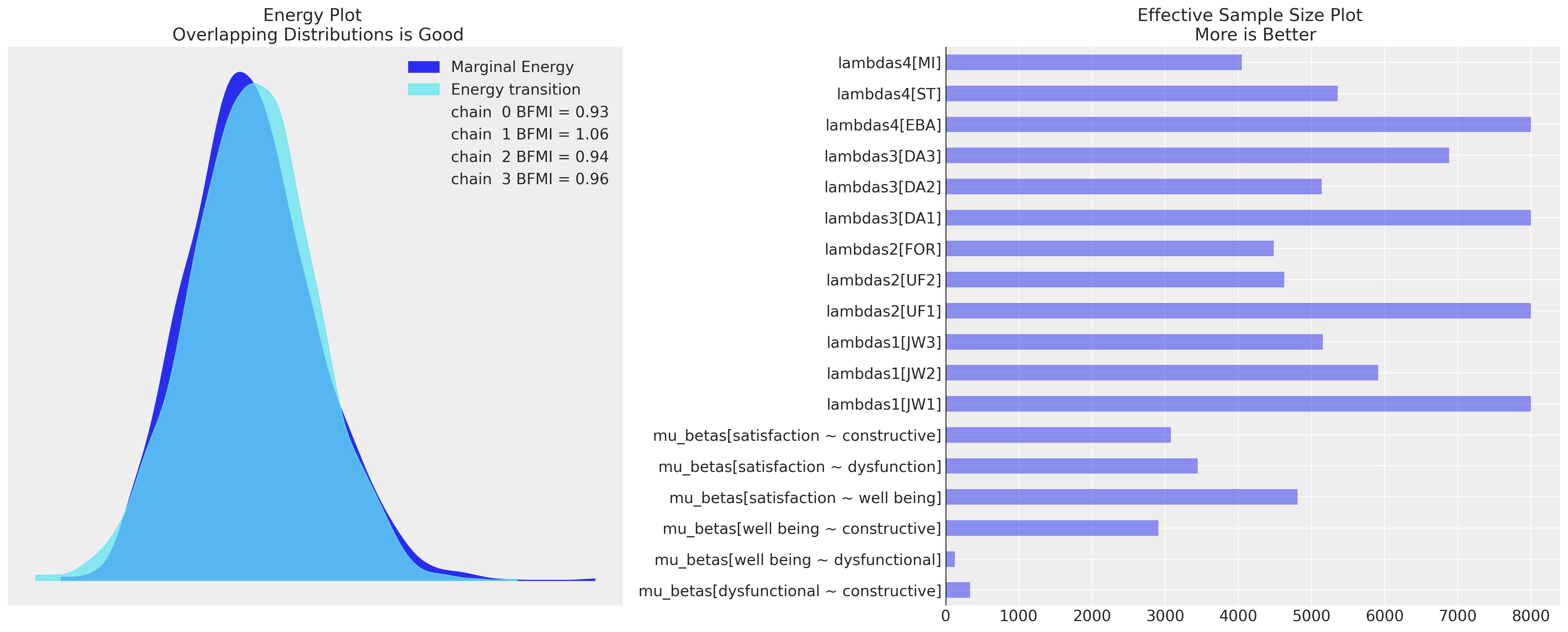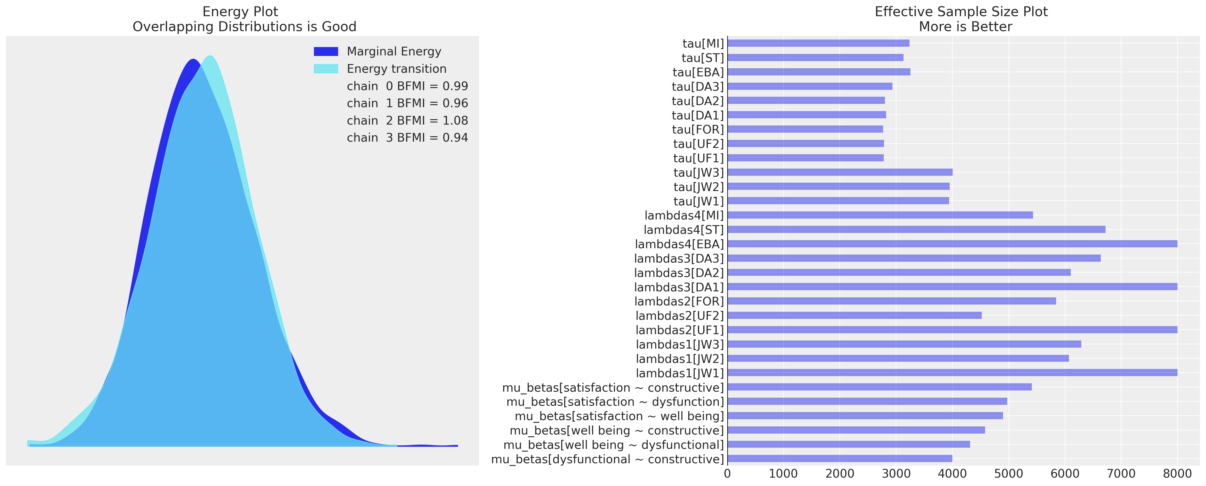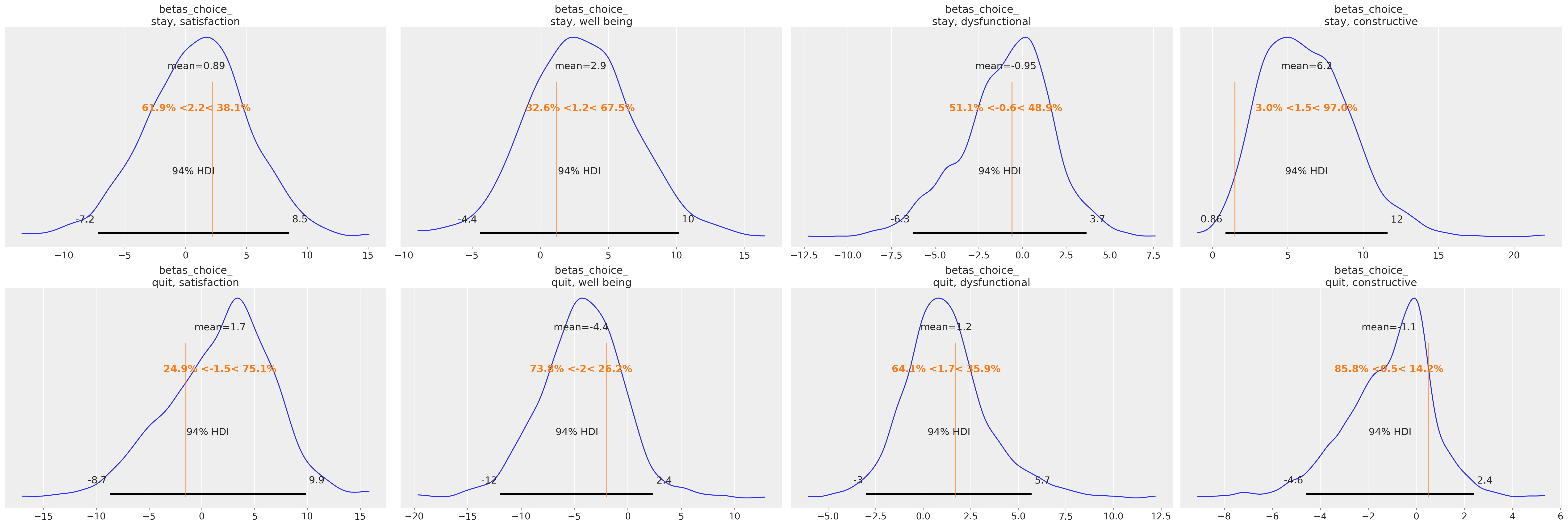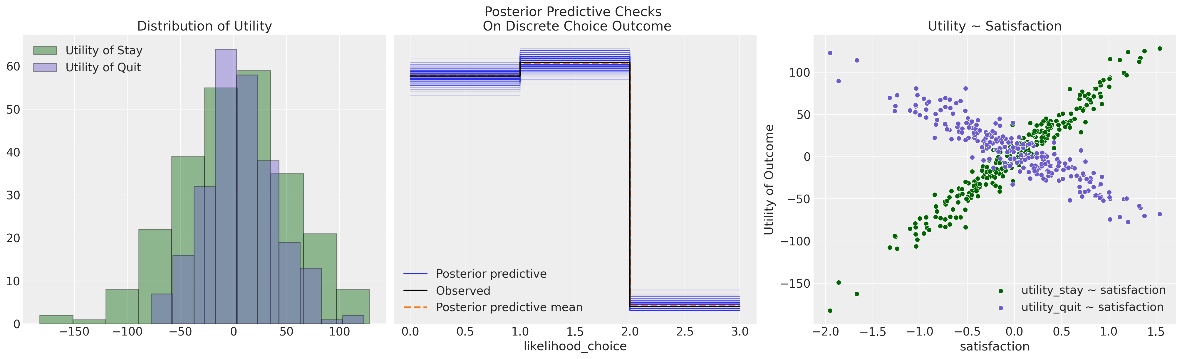 We can recover the inverse relationship we encoded in the outcomes between job-satisfaction and the choice to stay. Similarly, this posterior predictive checks look sound. This is encouraging.