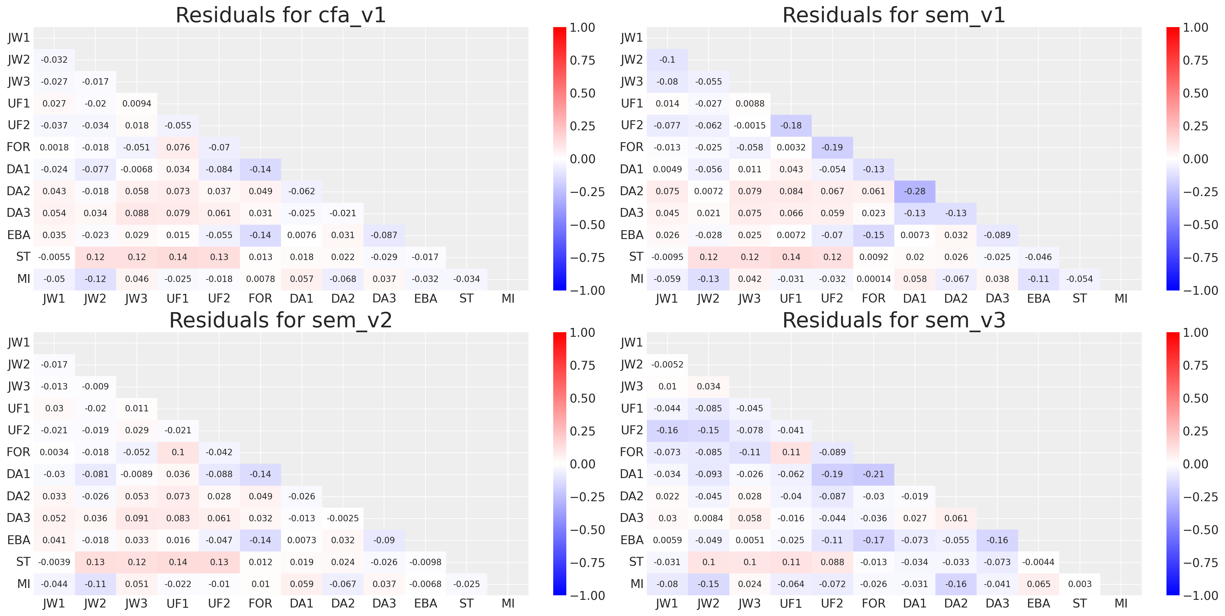The structure of the SEM workflow mirrors the Bayesian workflow closely. Each step—from specifying measurement models to refining residual covariances—reflects the same cycle of hypothesis formulation, model testing, and iterative improvement.