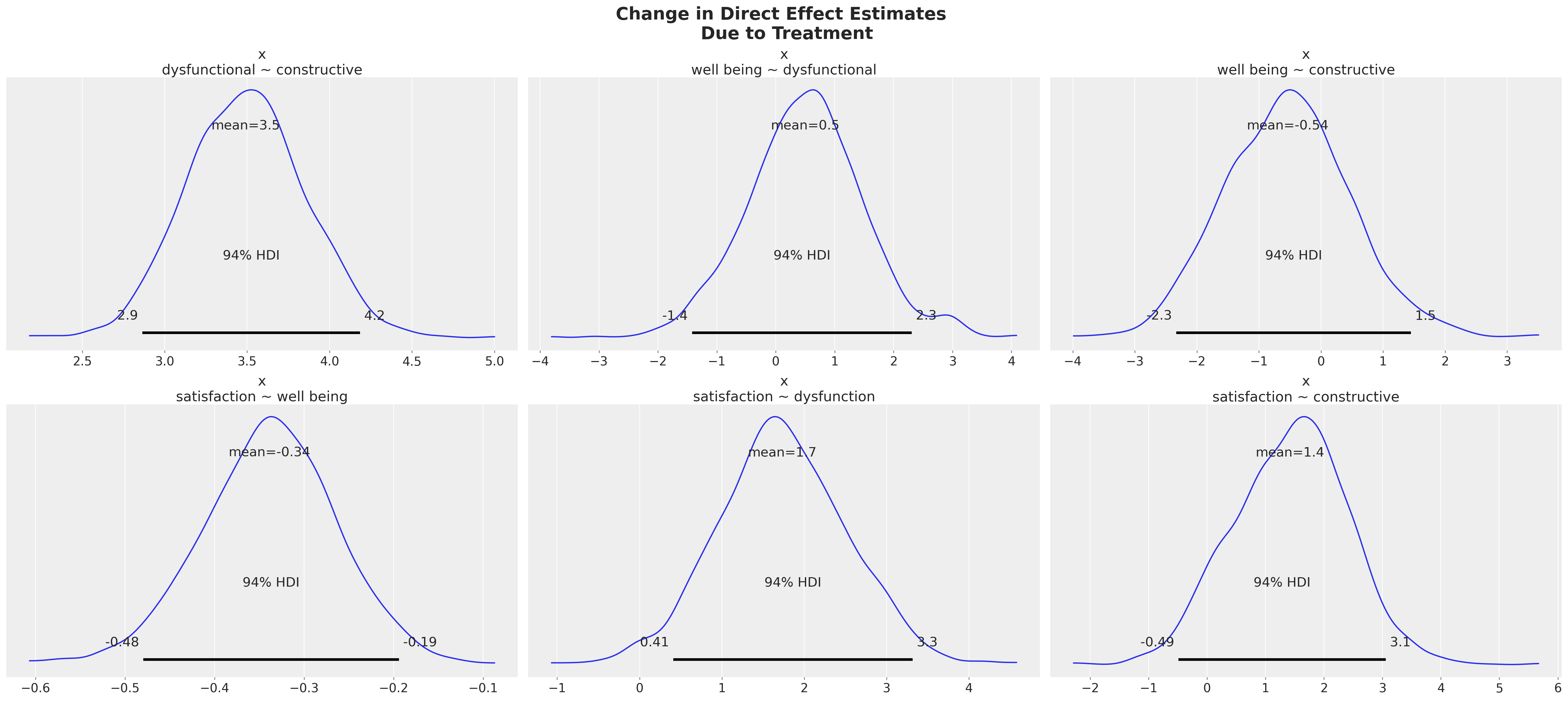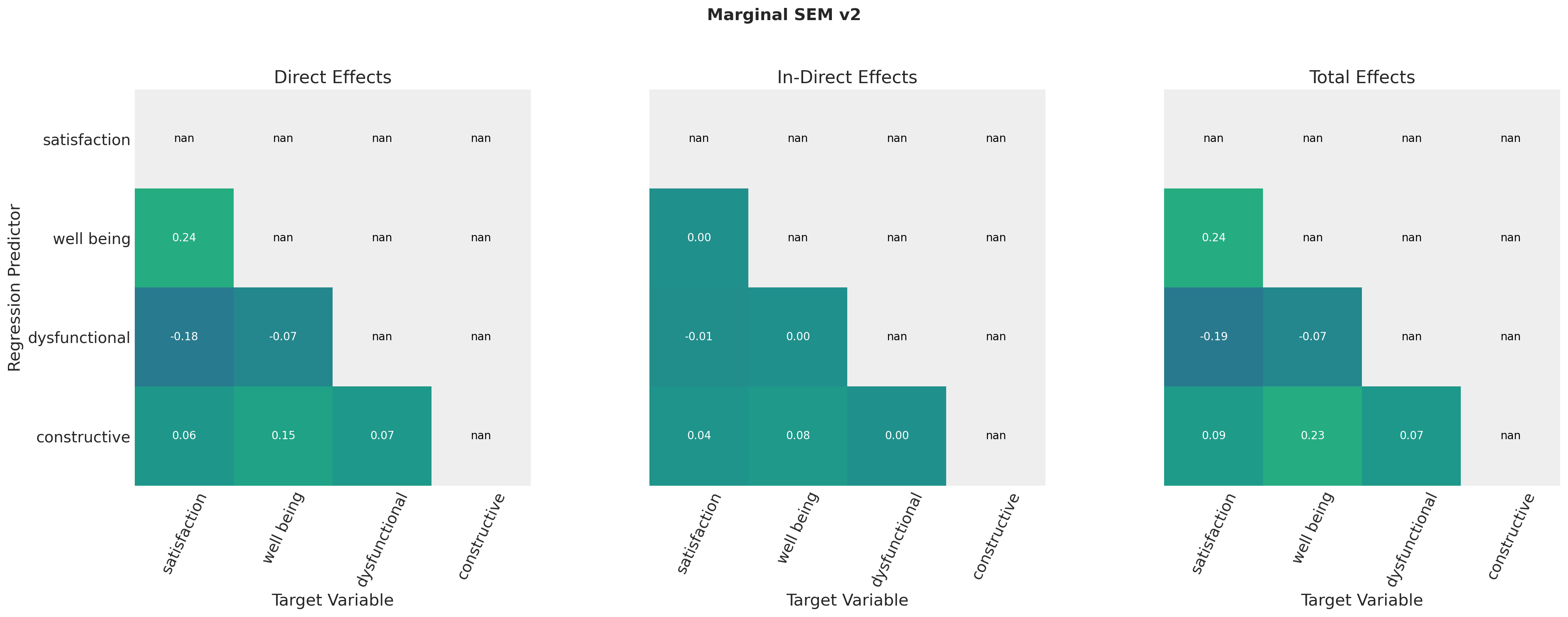 In the structural model we specify how we believe the latent constructs relate to one another. The term \((I - B)^{-1}\) is sometimes called the total effects matrix because it can be expanded as \(I + B + B^{2} + B^{3}...\) summing all possible chains of paths in the system. As we’ll see the structural and mediating paths between these latent constructs can be additive. This observation allows us to very elegantly derive total, indirect and direct effects within the system.