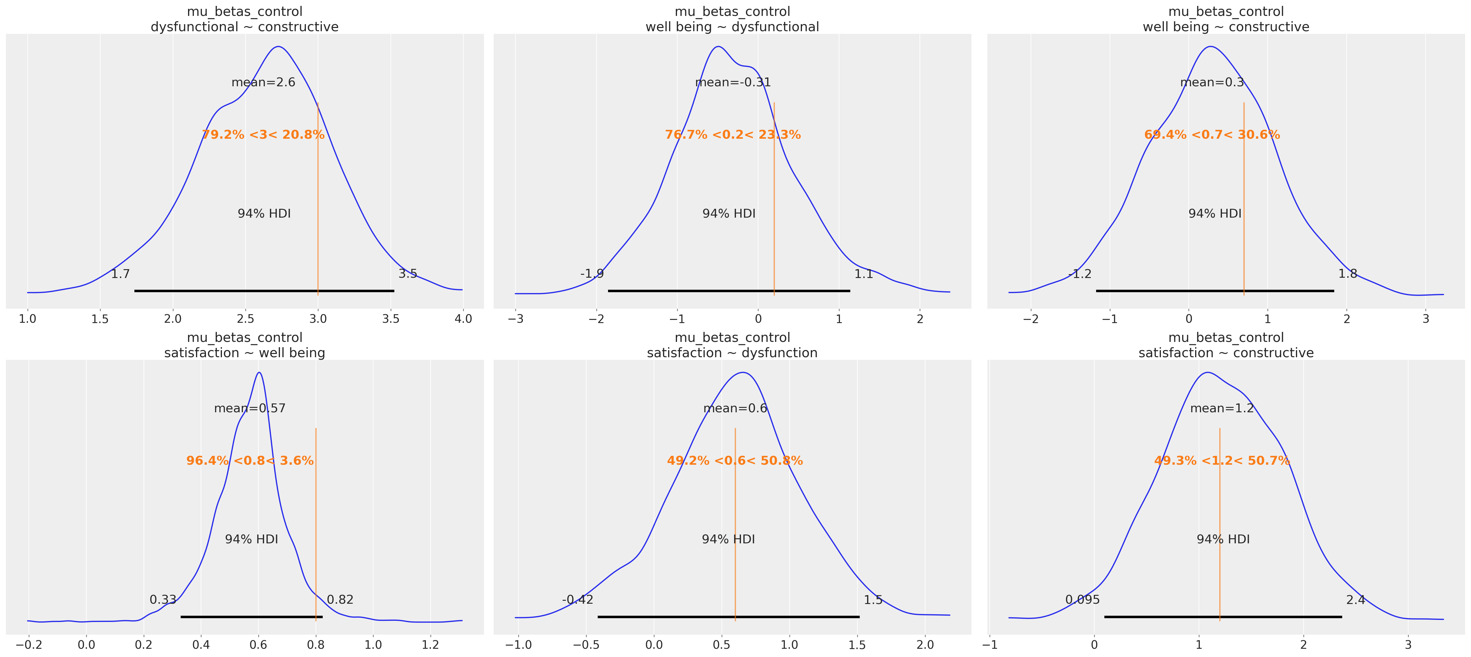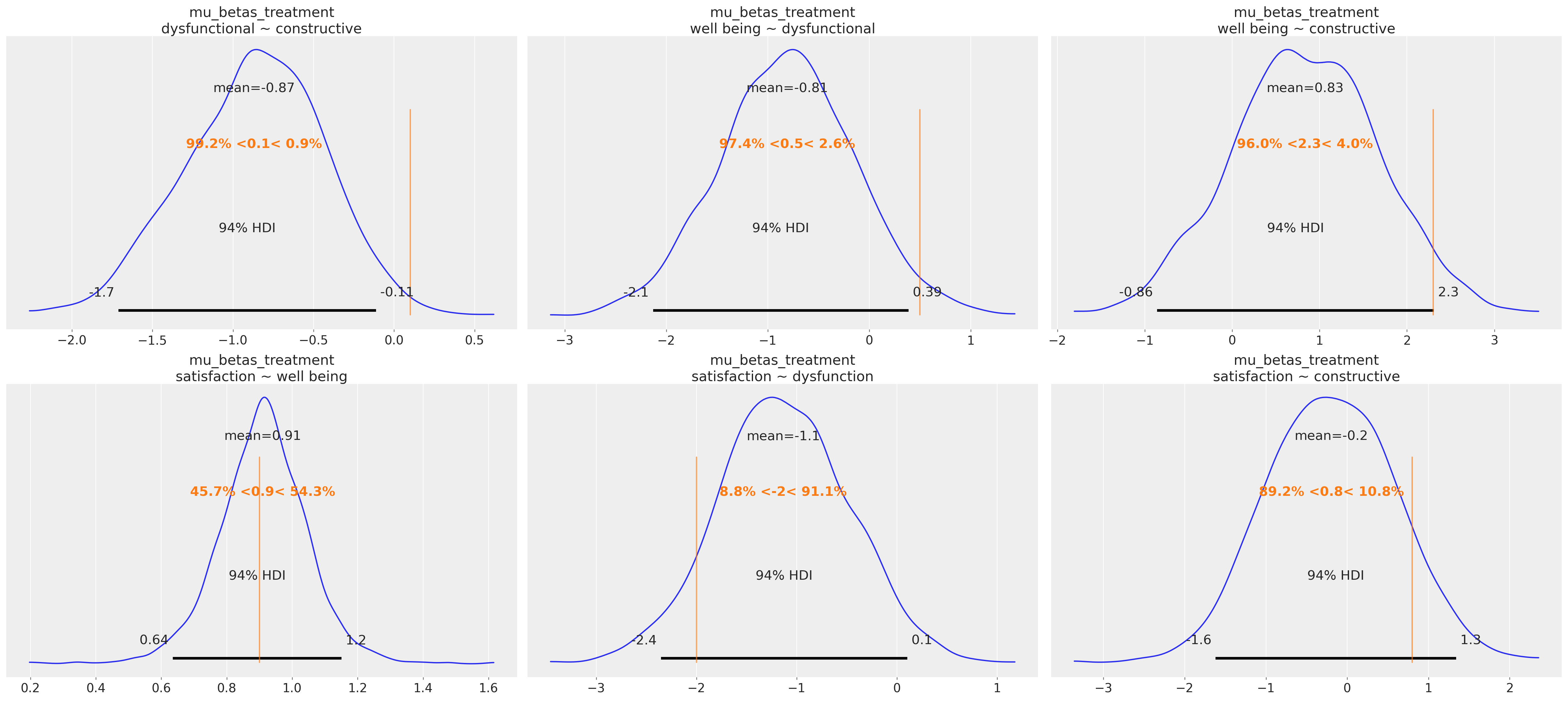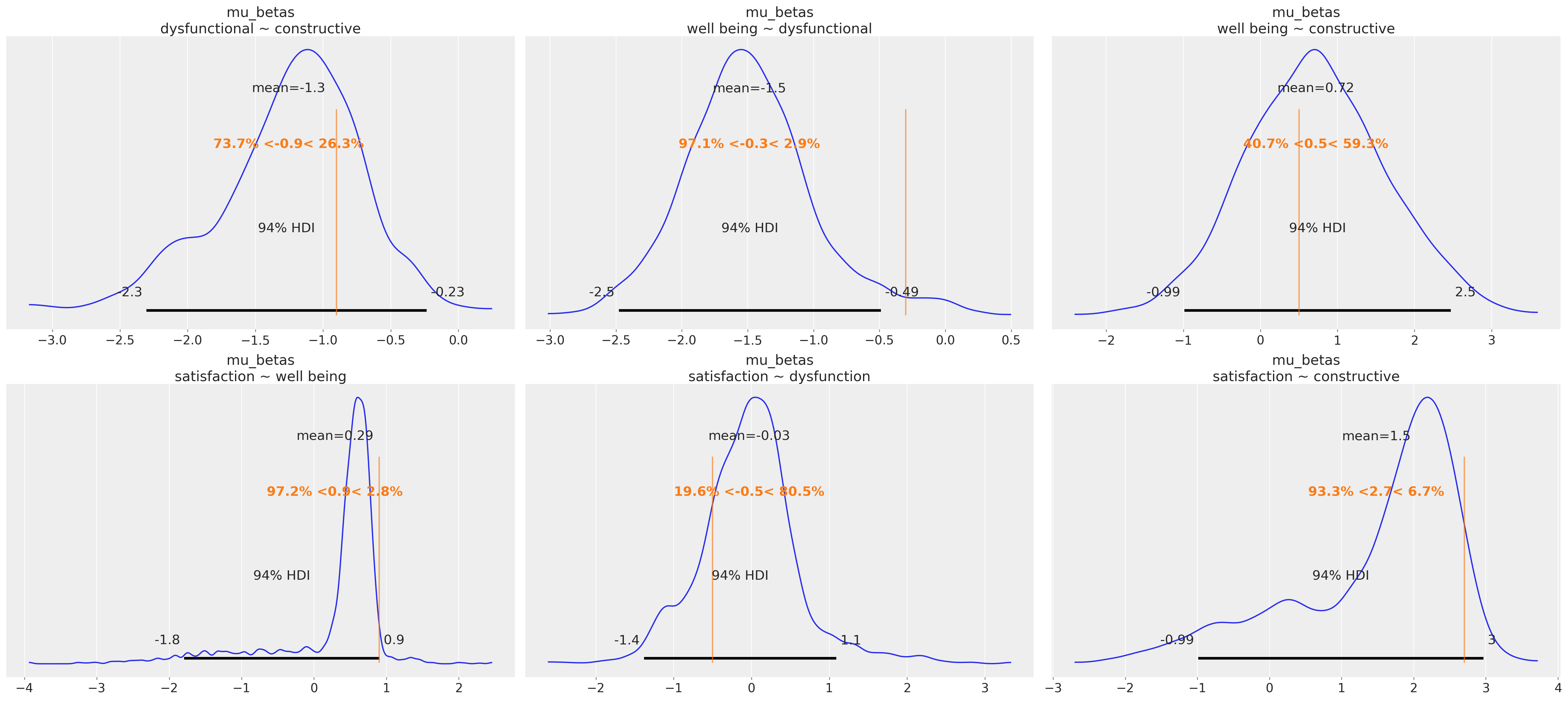 az.plot_posterior(idata, var_names=["mu_betas"], ref_val=fixed_parameters["mu_betas"]);