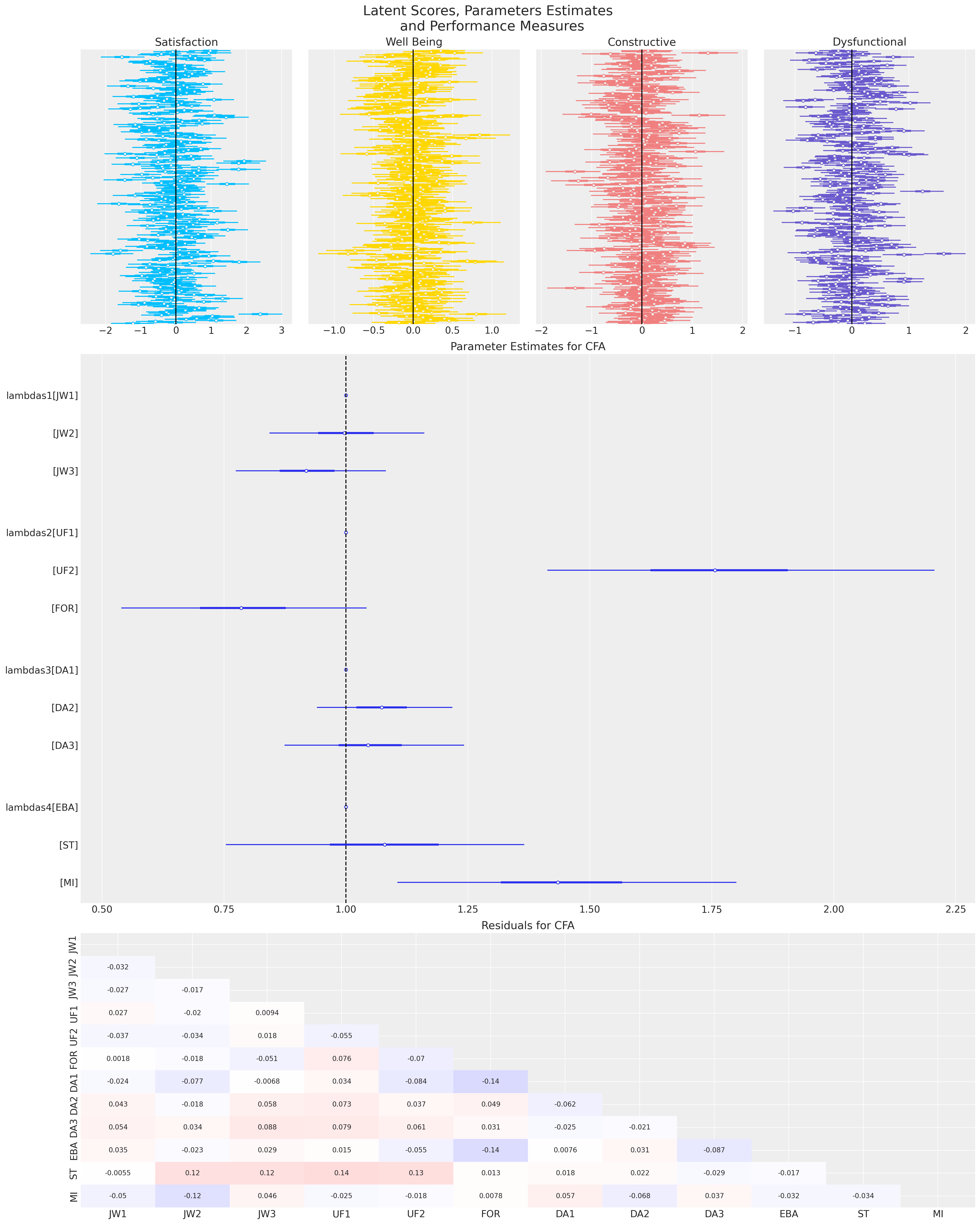 where \(\Lambda\) is a 12 x 4 matrix, and \(\eta\) is an \(N\) x 4 matrix, for \(N\) observations i.e. the matrix of latent scores on each of the four factors for all individual responses. In the measurement model we’re aiming to ensure that the observed metrics are well grouped under a single factor. That they “move” well together and respond to changes in the factor.