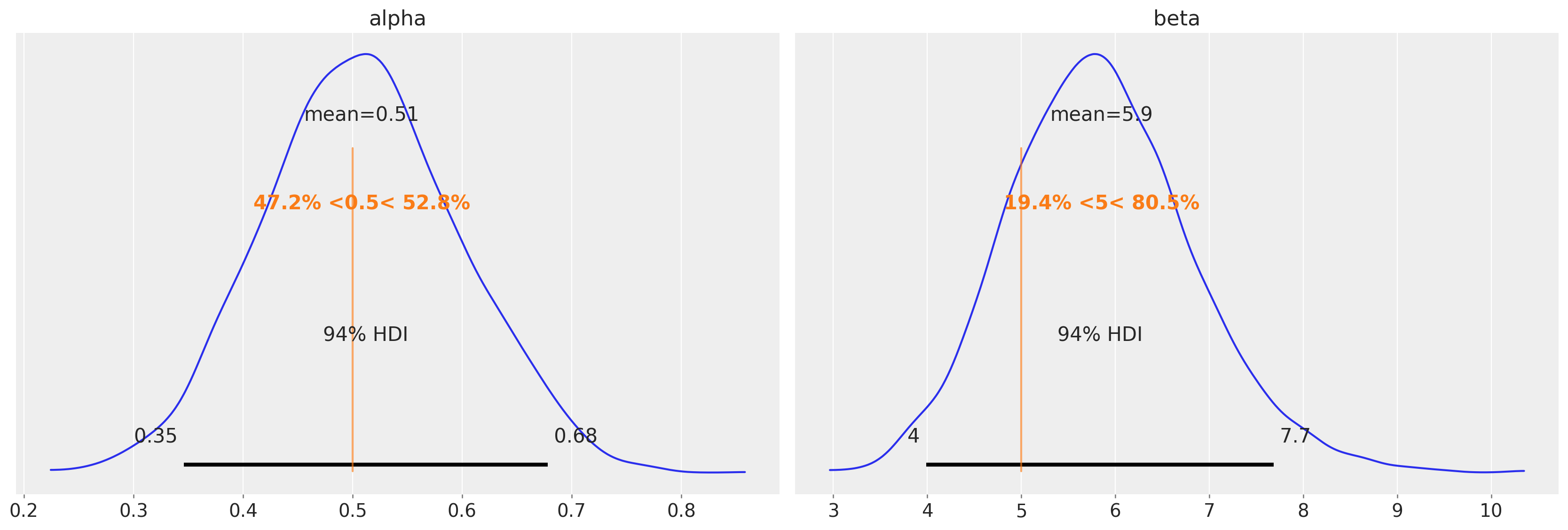 az.plot_posterior(data=tr_alt, ref_val=[true_alpha, true_beta]);