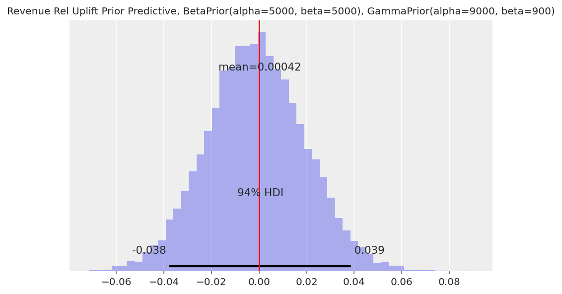 Variant B’s conversion rate uplift has a HDI well below 0, while the revenue per converting visitor has a HDI well above 0. So the model is able to capture the reduction in purchasing visitors as well as the increase in mean purchase amount.