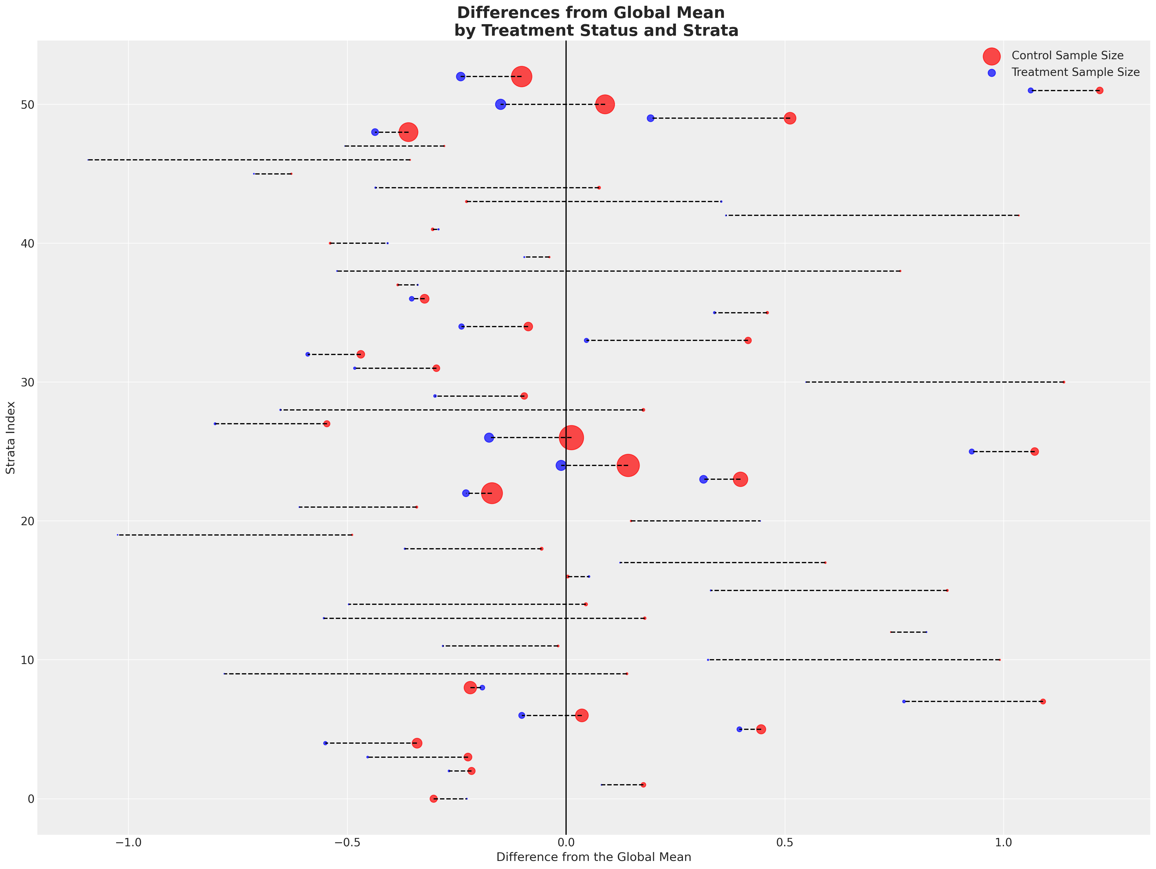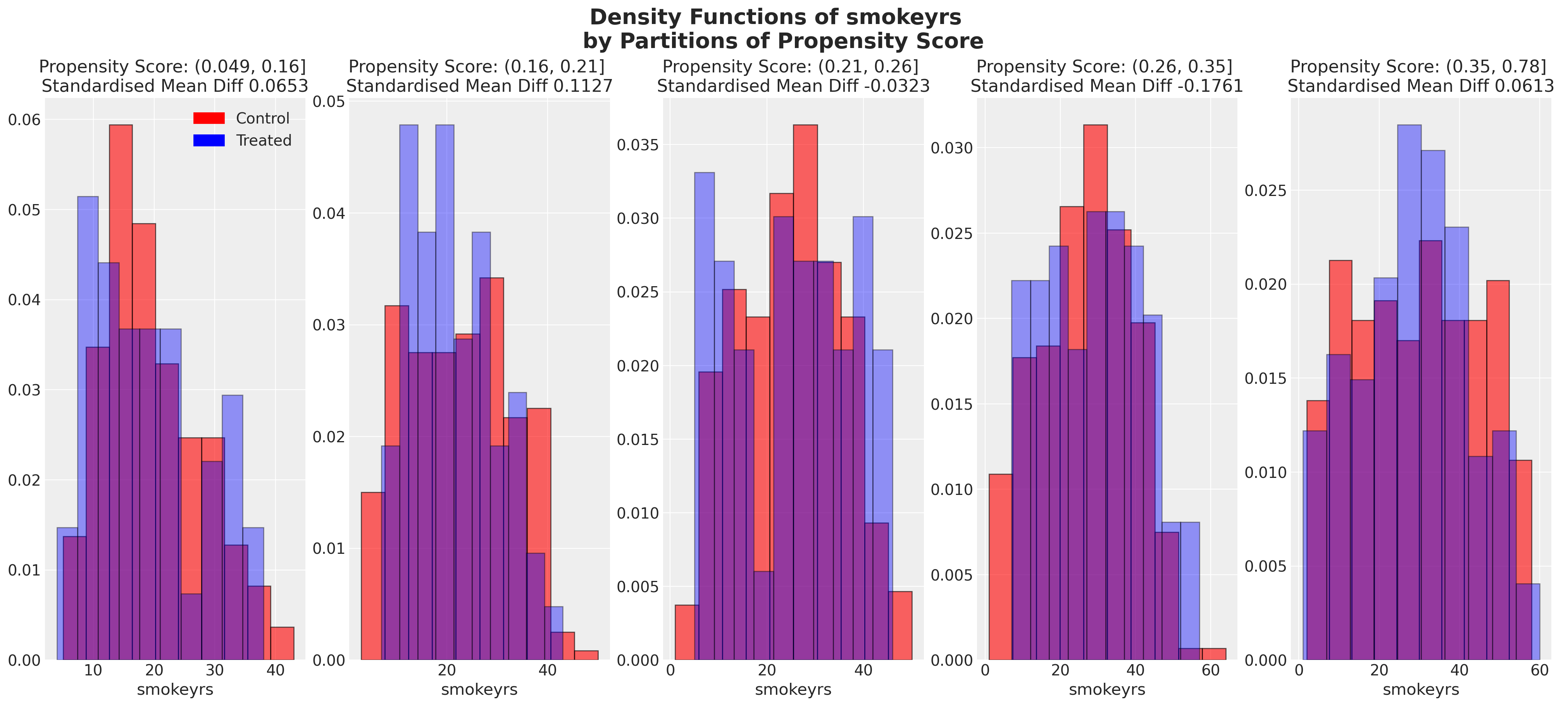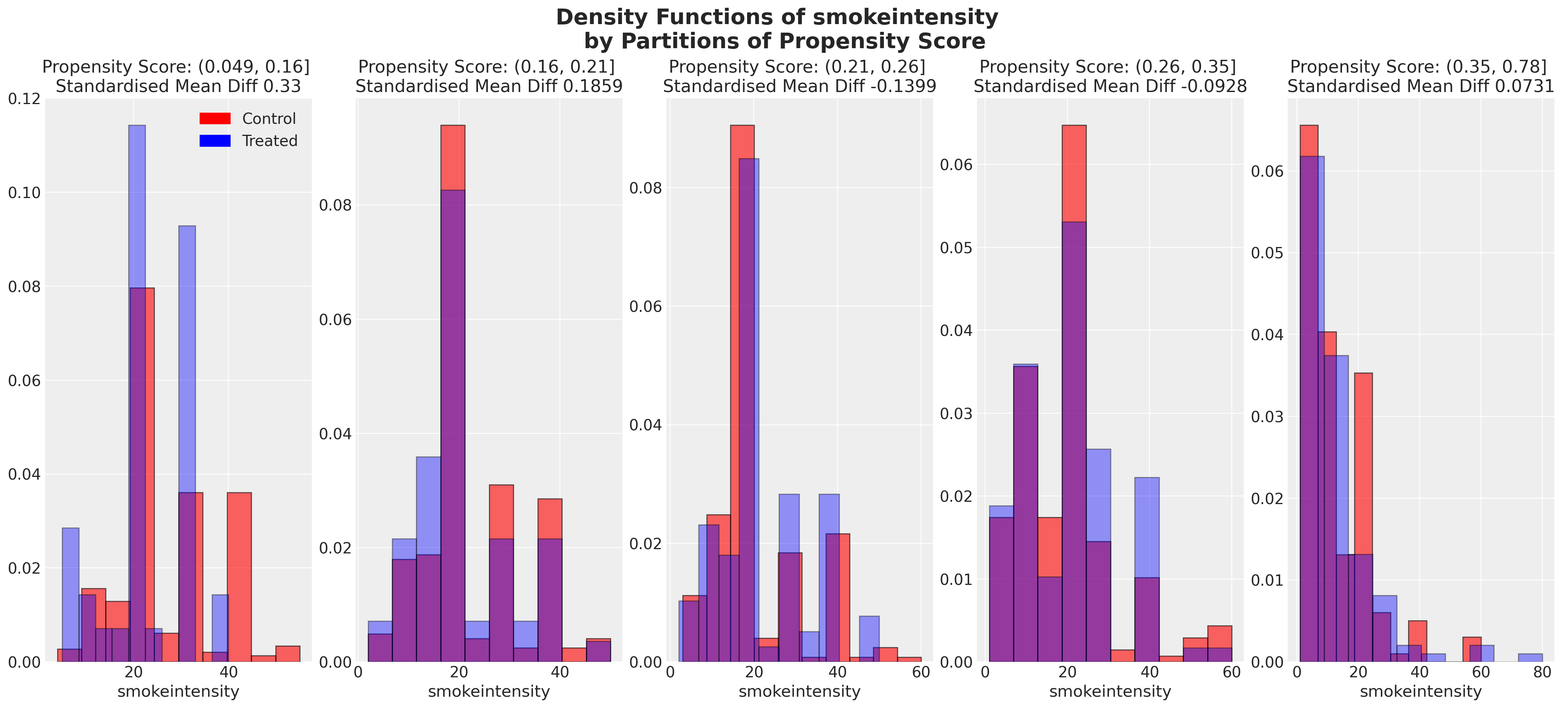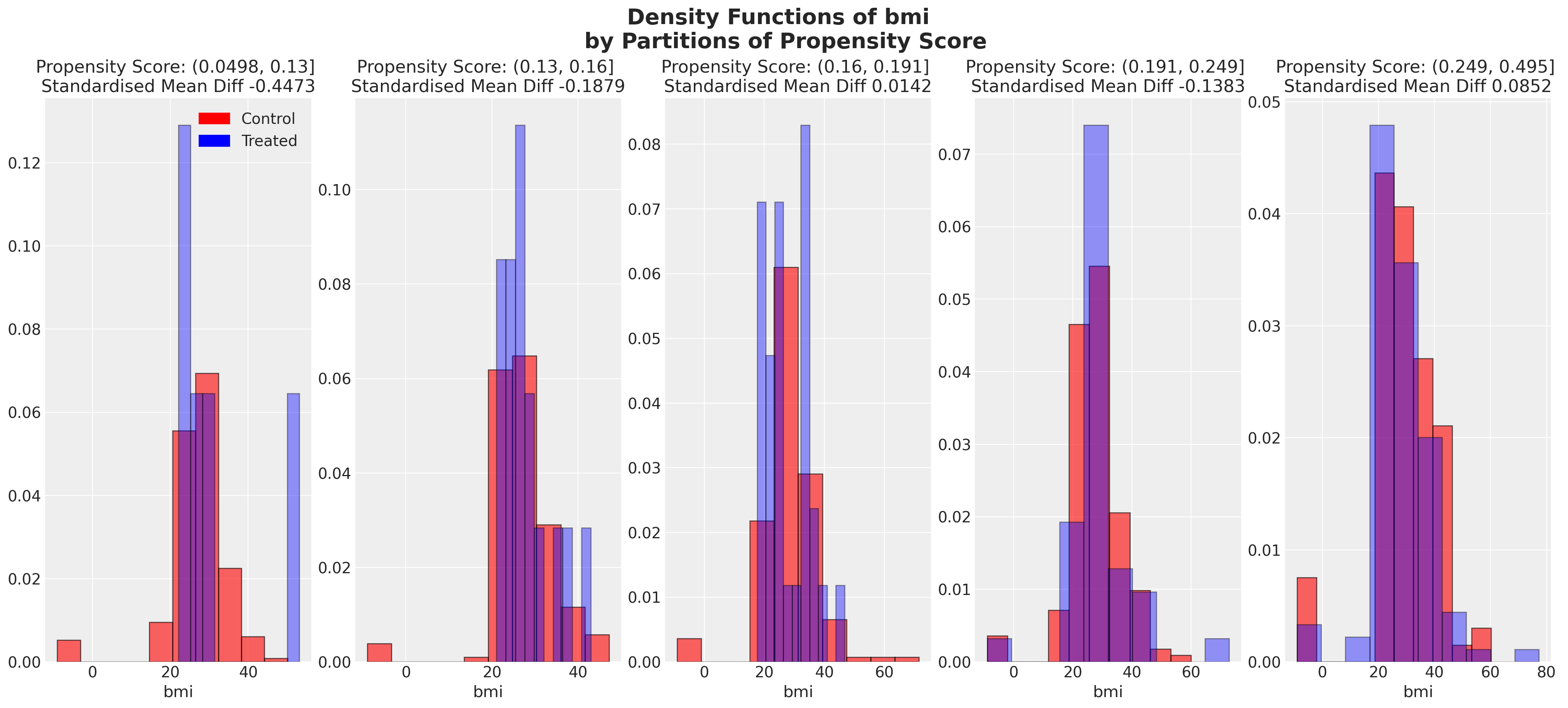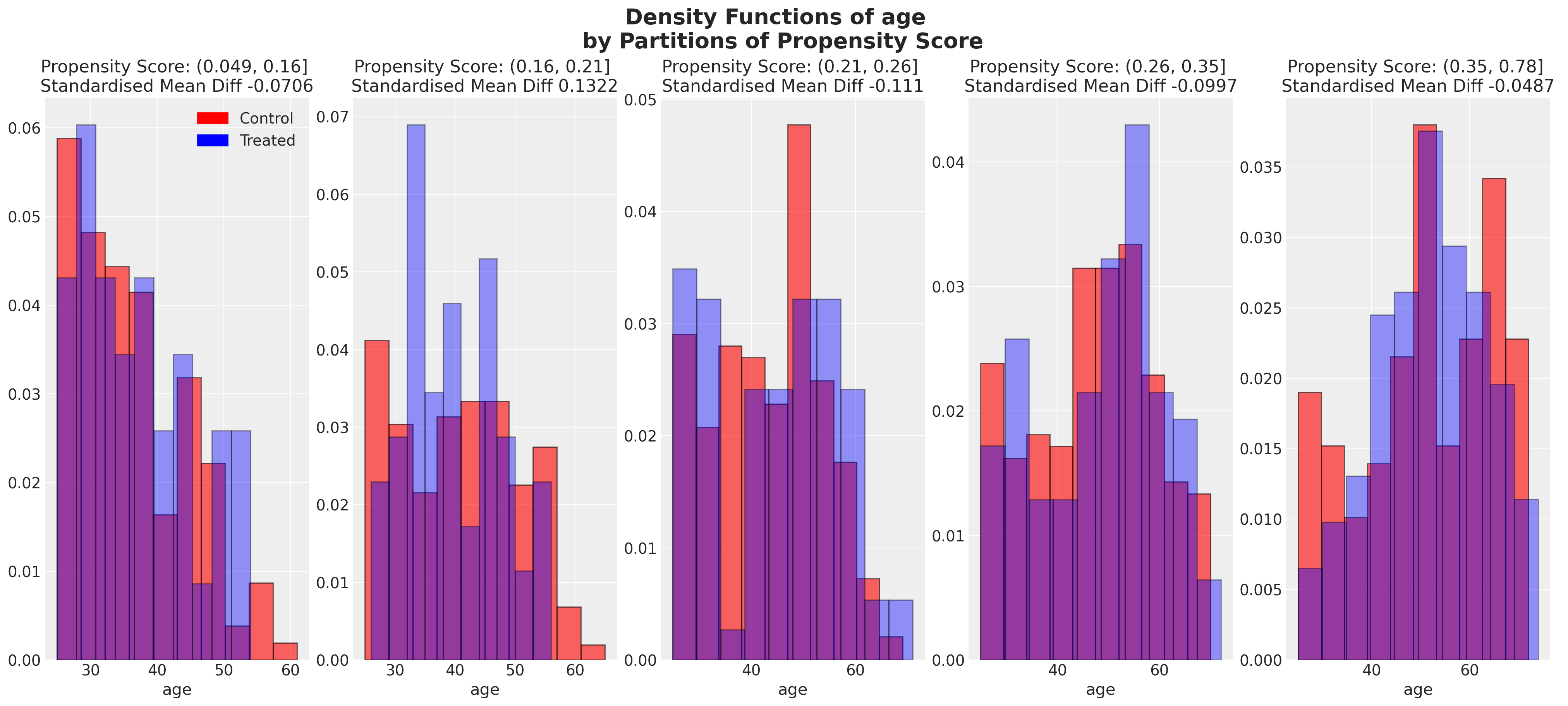 We see that there is some overall differences between the two groups, but splitting this out further we might worry that the differences are due to how the groups are imbalanced across the different covariate profiles in the treatment and control groups. That is to say, we can inspect the implied differences across different strata of our data to see that we might have imbalance across different niches of the population. This imbalance, indicative of some selection effects into the treatment status, is what we hope to address with propensity score modelling.