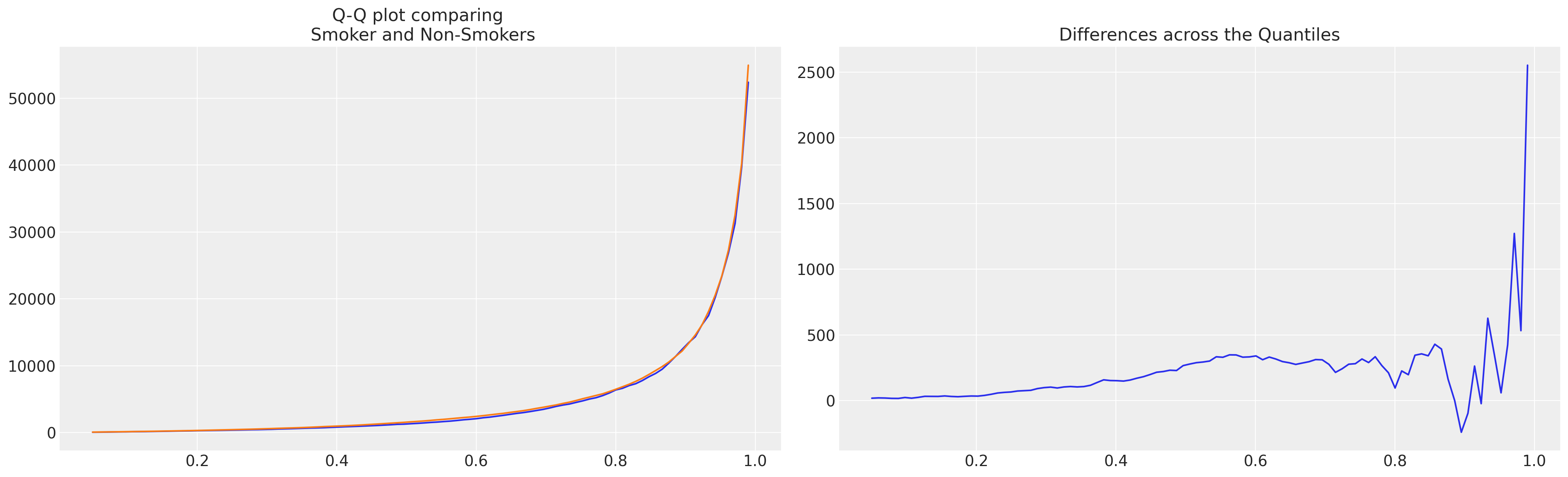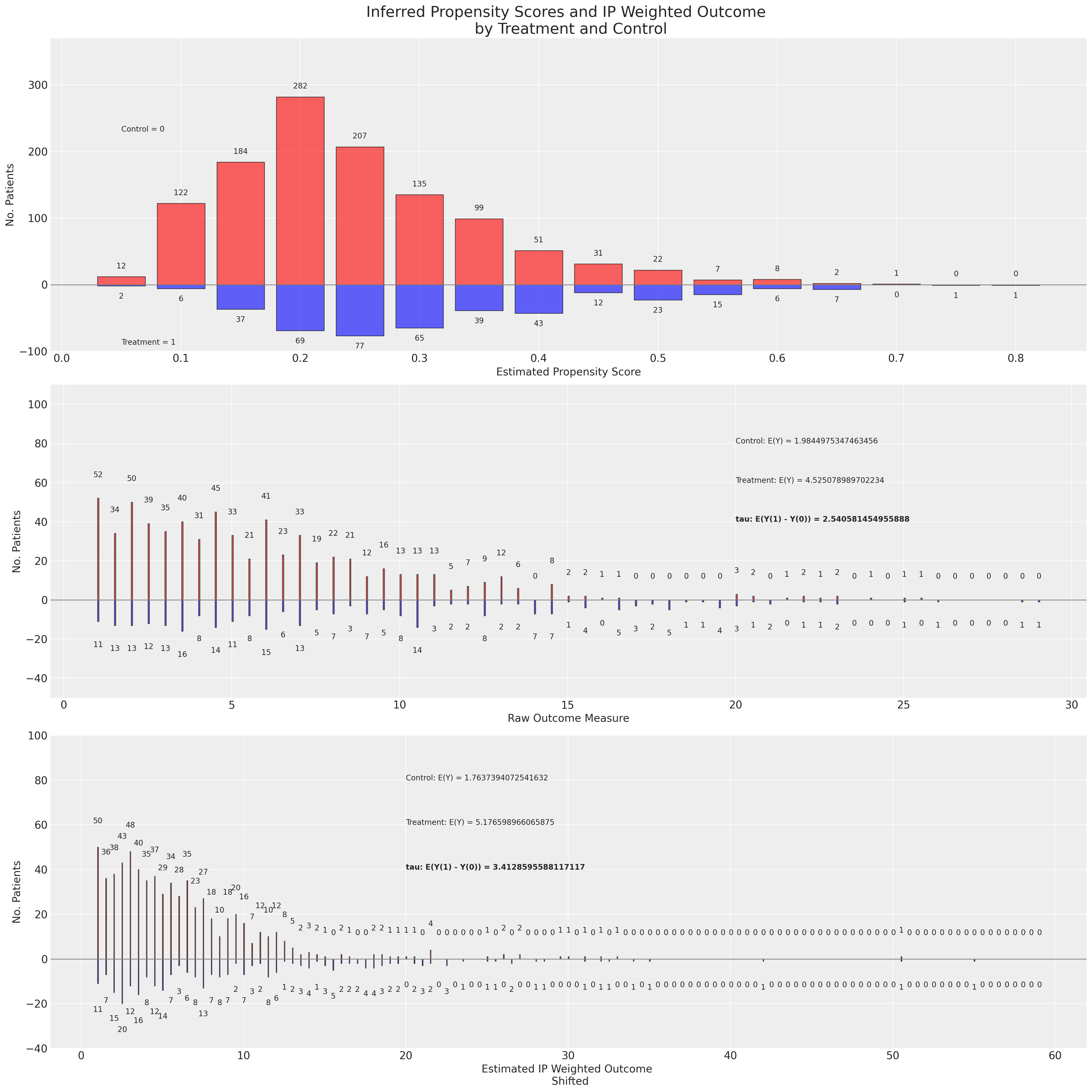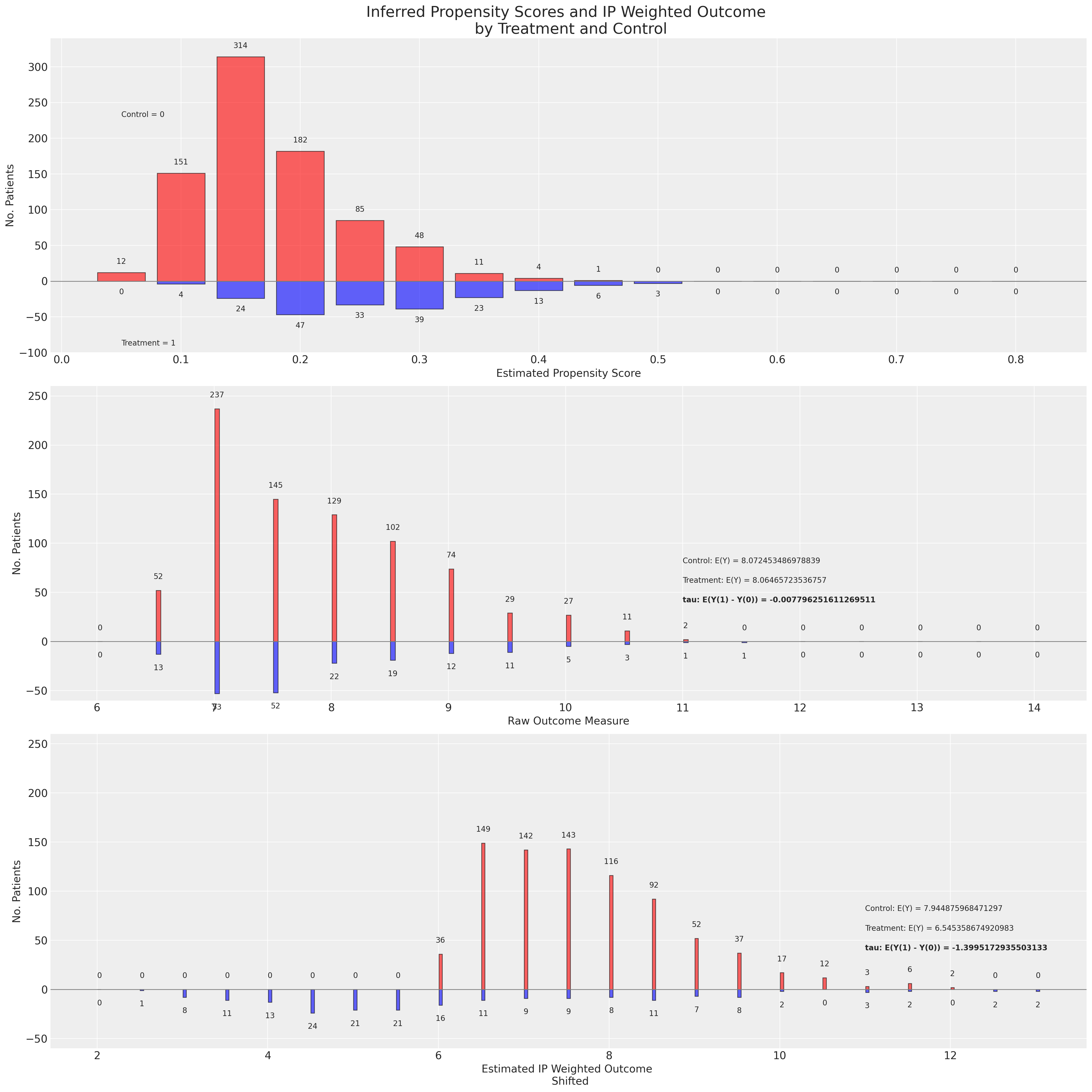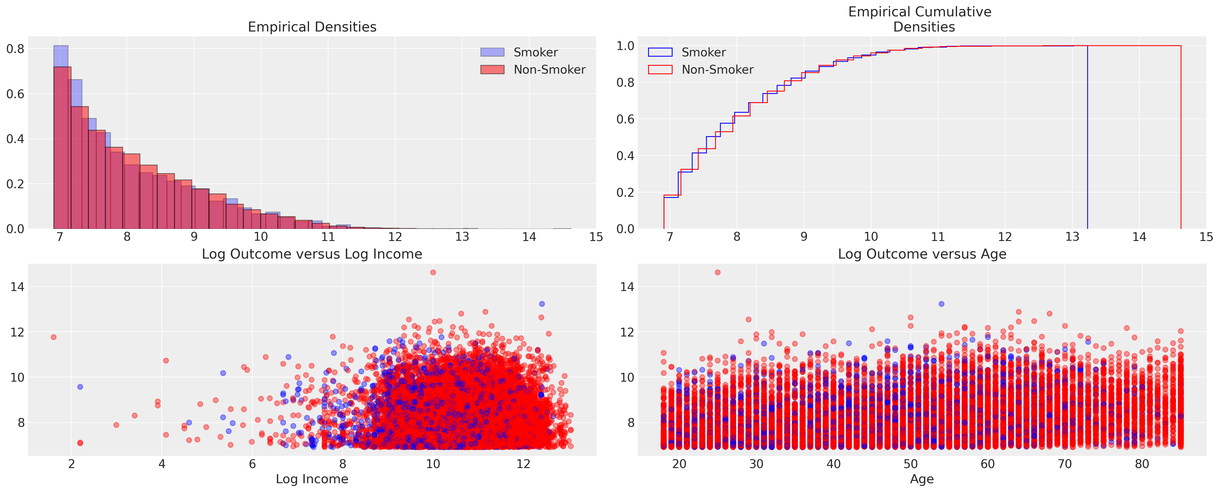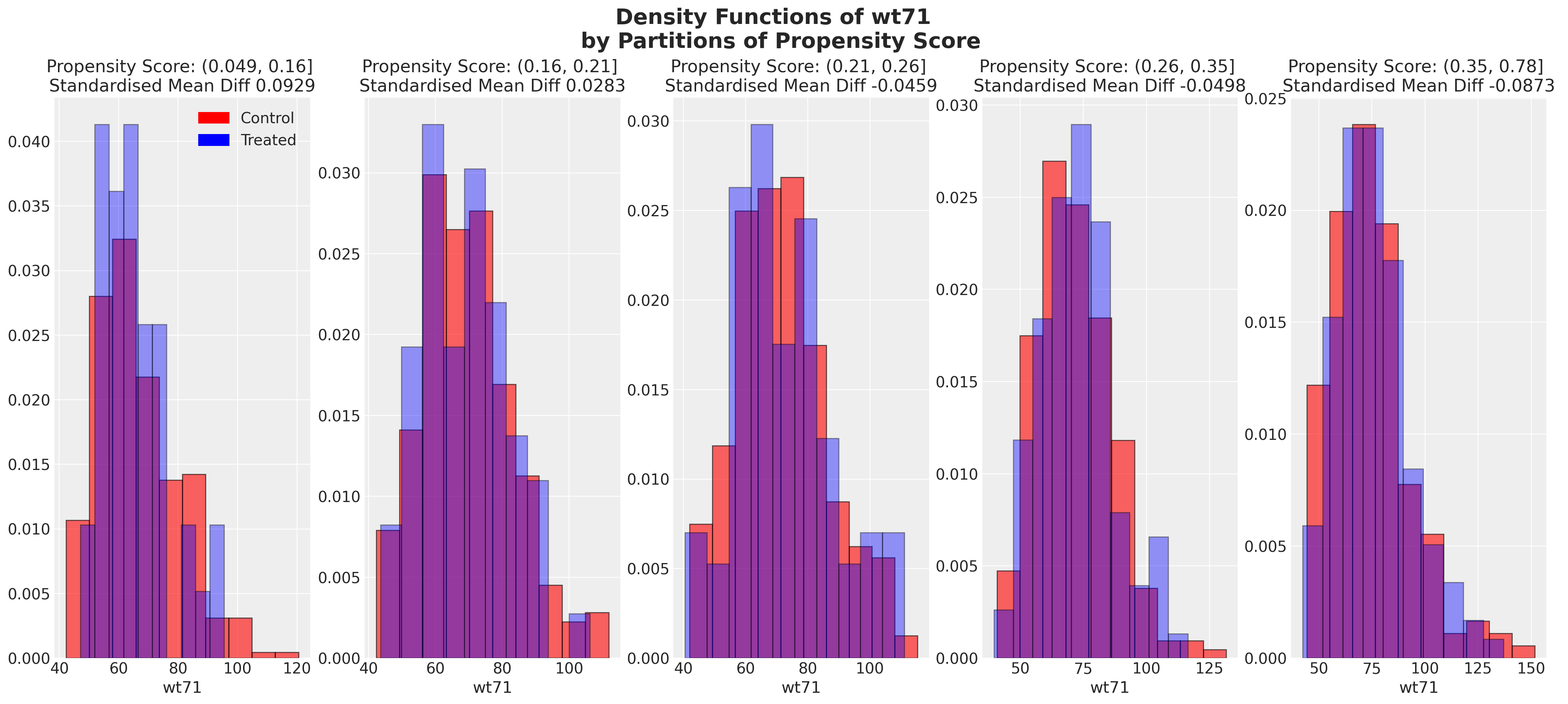 We see that there is some overall differences between the two groups, but splitting this out further we might worry that the differences are due to how the groups are imbalanced across the different covariate profiles in the treatment and control groups. That is to say, we can inspect the implied differences across different strata of our data to see that we might have imbalance across different niches of the population. This imbalance, indicative of some selection effects into the treatment status, is what we hope to address with propensity score modelling.