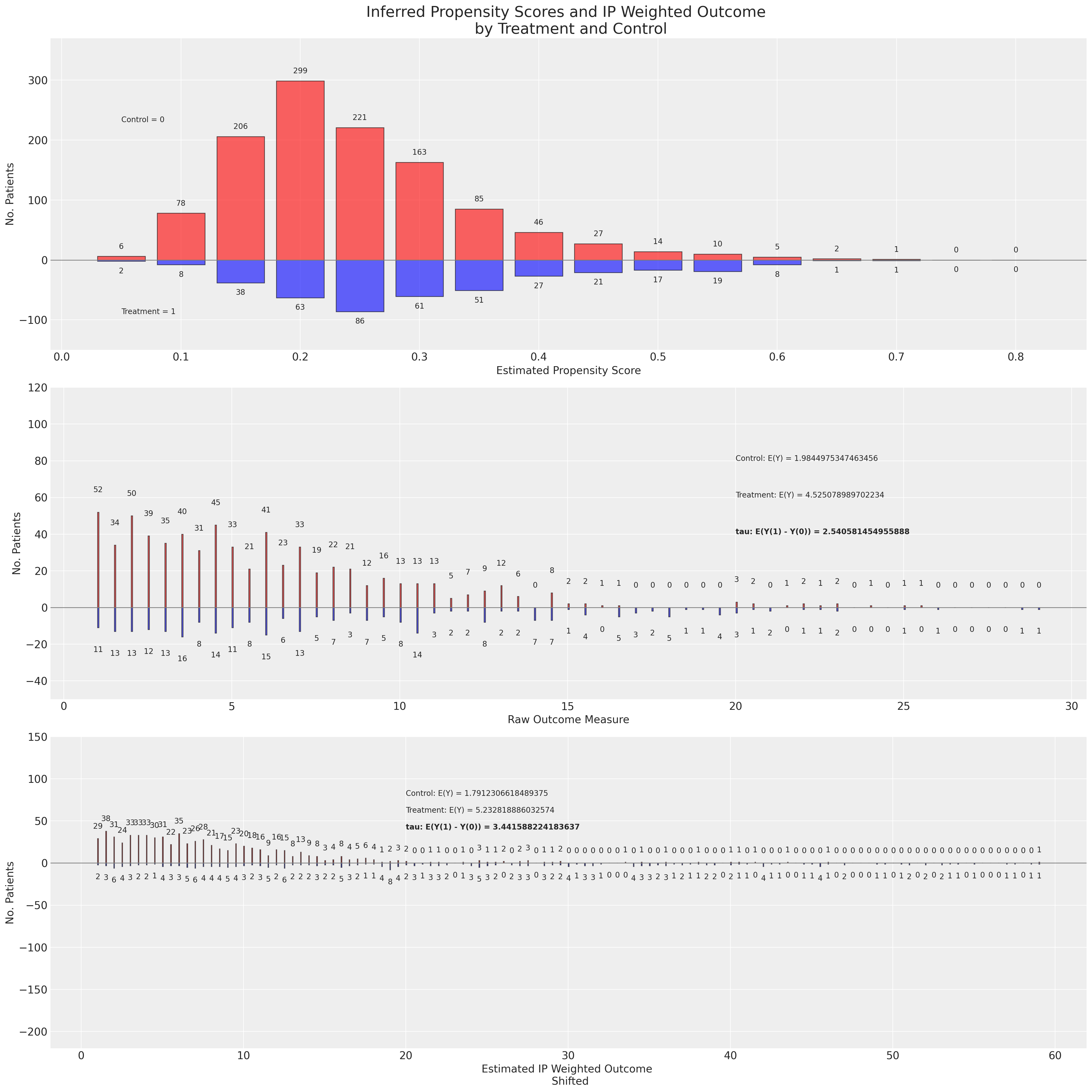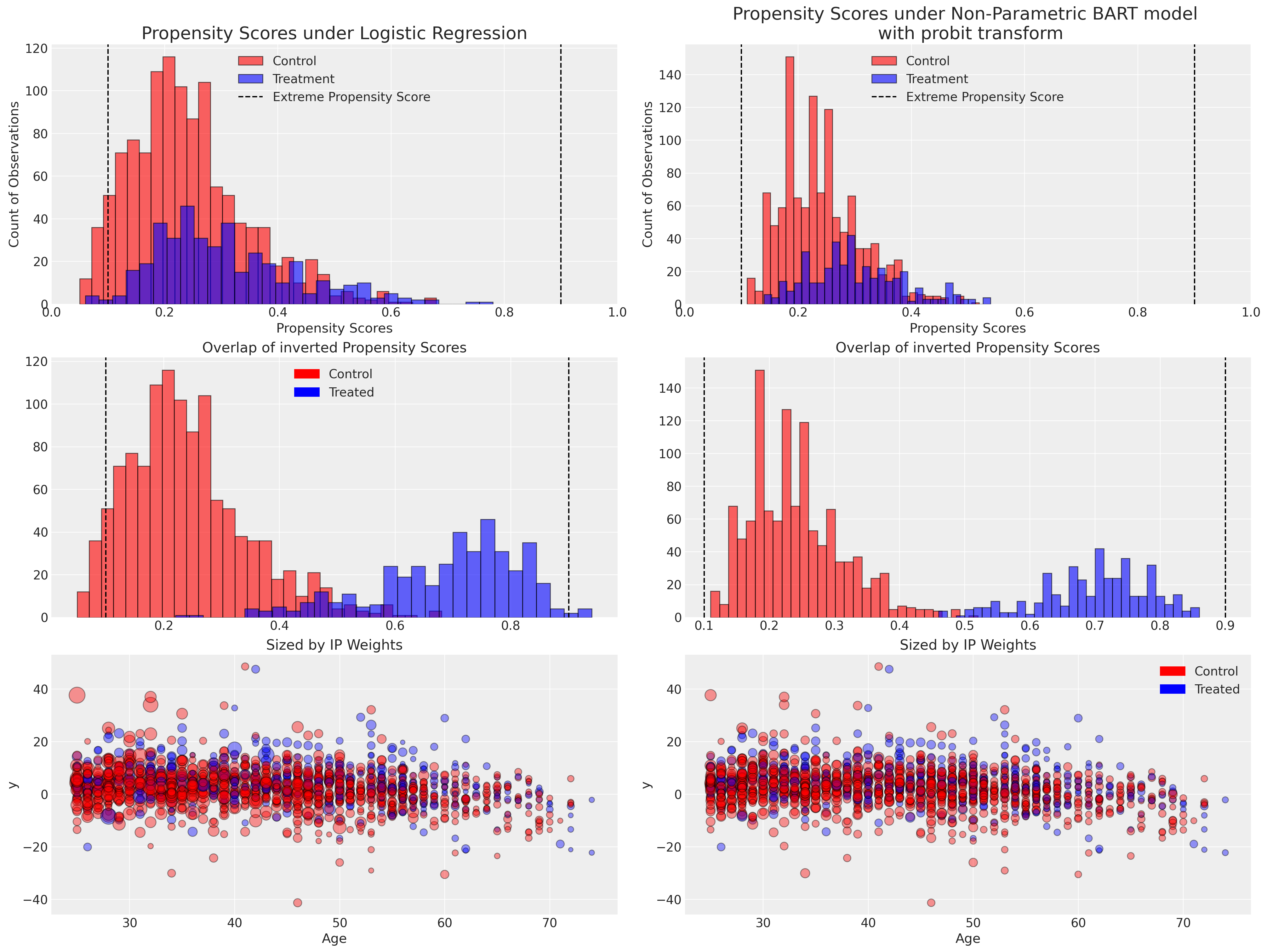 In this notebook we will explain and motivate the usage of propensity scores in the analysis of causal inference questions. Our focus will be on the manner in which we (a) estimate propensity scores and (b) use them in the analysis of causal questions. We will see how they help avoid risks of selection bias in causal inference and where they can go wrong. This method should be comfortable for the Bayesian analyst who is familiar with weighting and re-weighting their claims with information in the form of priors. Propensity score weighting is just another opportunity to enrich your model with knowledge about the world. We will show how they can be applied directly, and then indirectly in the context of debiasing machine learning approaches to causal inference.