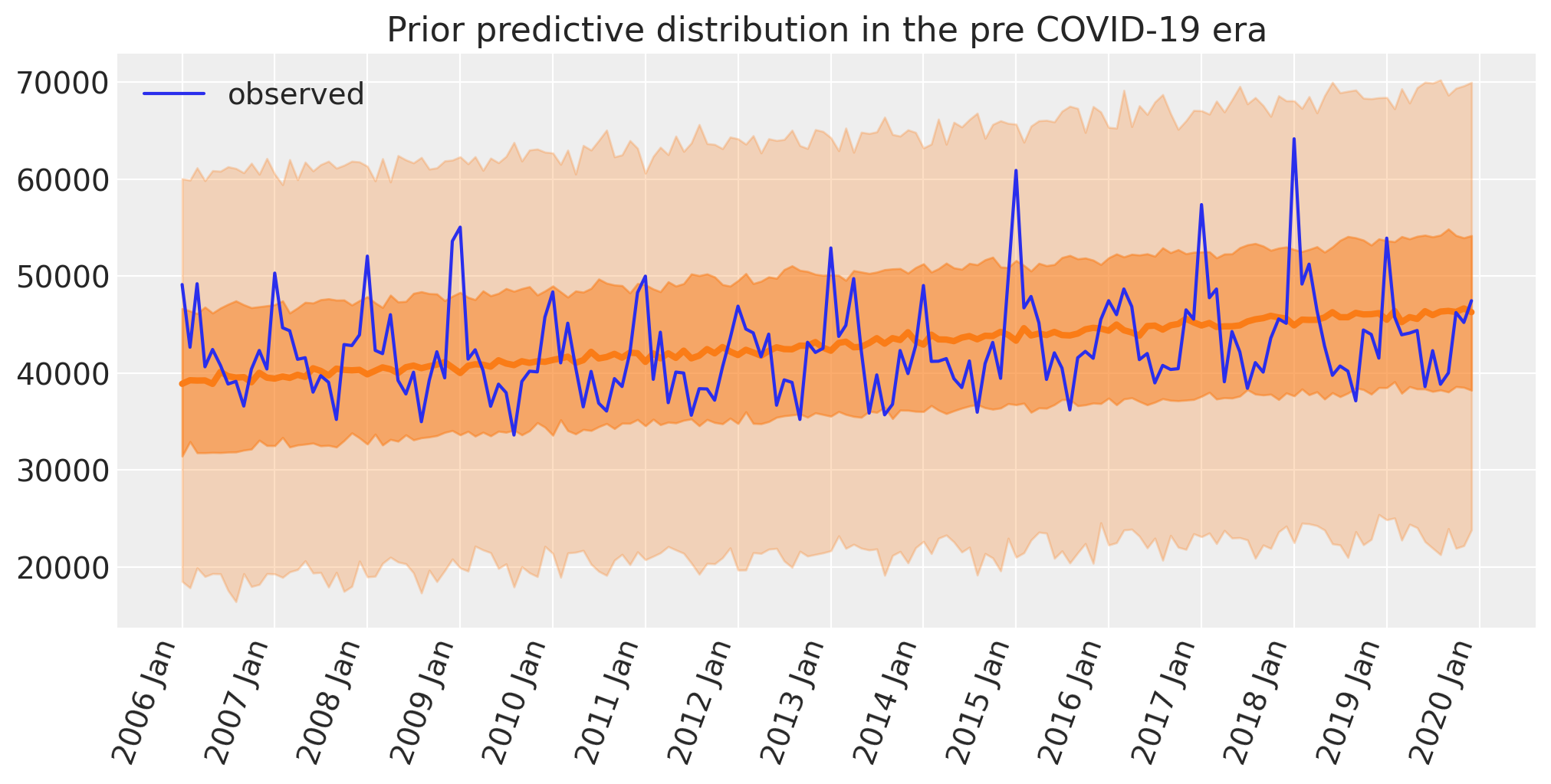 Inferred the model parameters based on pre COVID-19 data, running prior and posterior predictive checks. We note that the model is pretty good, but as always there might be ways to improve the model in the future.