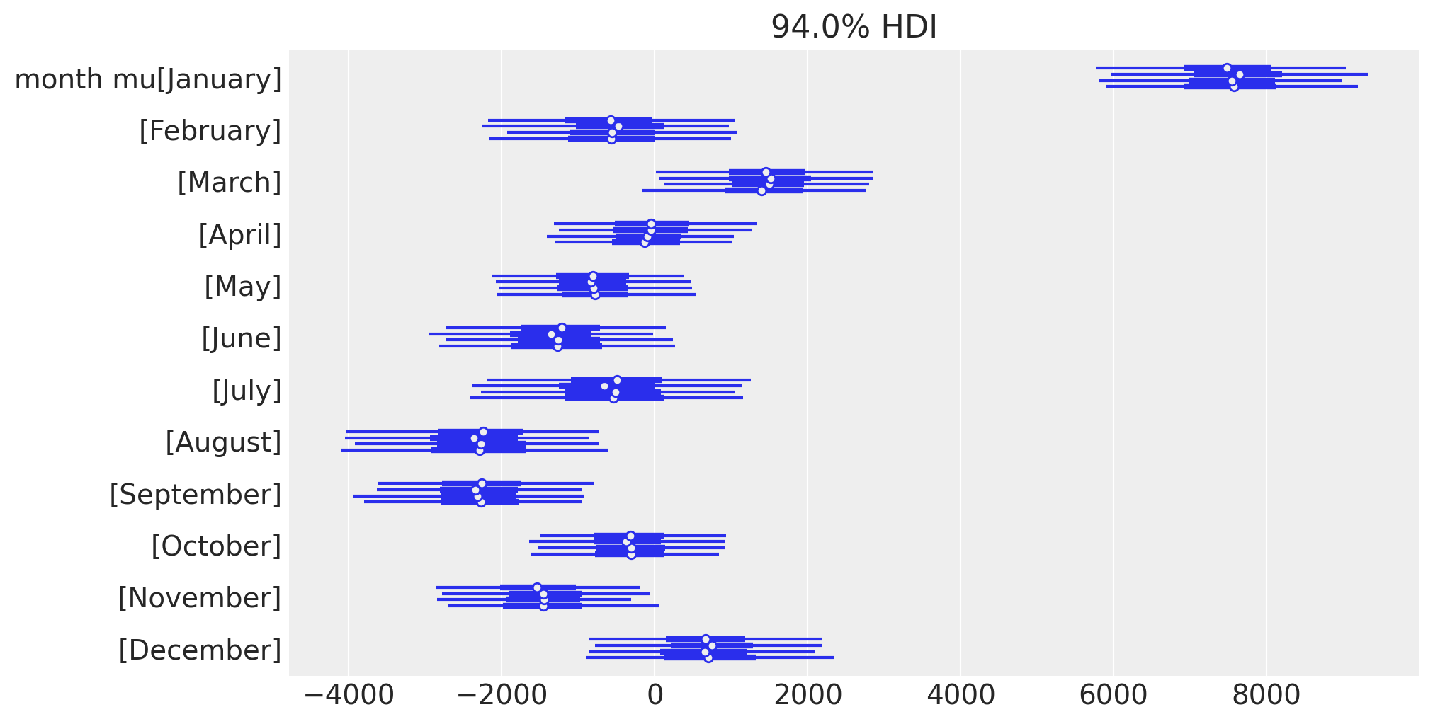az.plot_forest(idata.posterior, var_names="month mu", figsize=figsize);