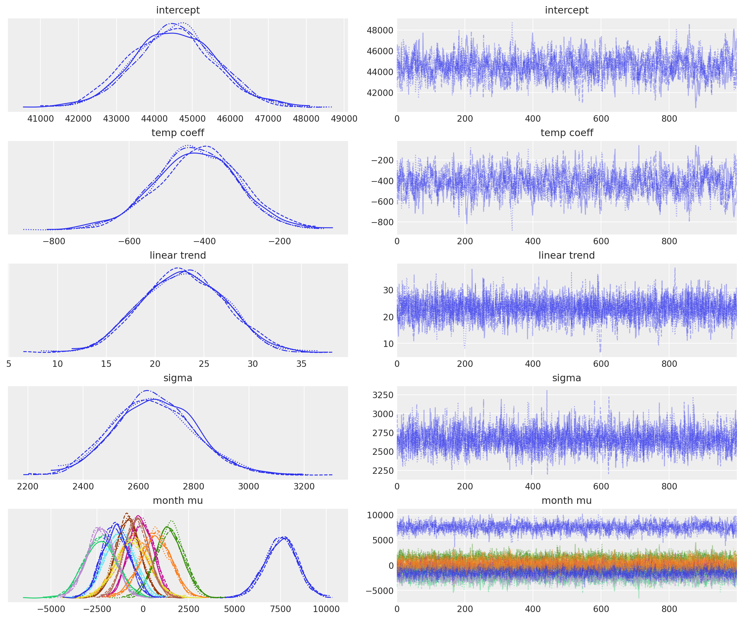 NUTS: [intercept, month mu_raw, linear trend, temp coeff, sigma]