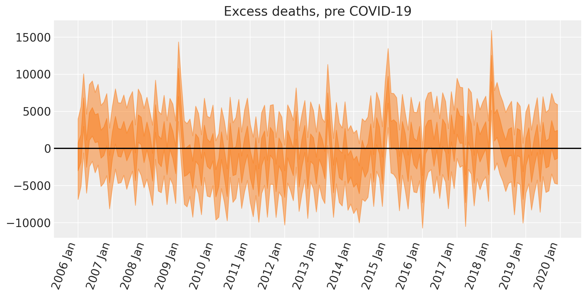 We can see that we have a few spikes here where the number of excess deaths is plausibly greater than zero. Such occasions are above and beyond what we could expect from: a) seasonal effects, b) the linearly increasing trend, c) the effect of cold winters.