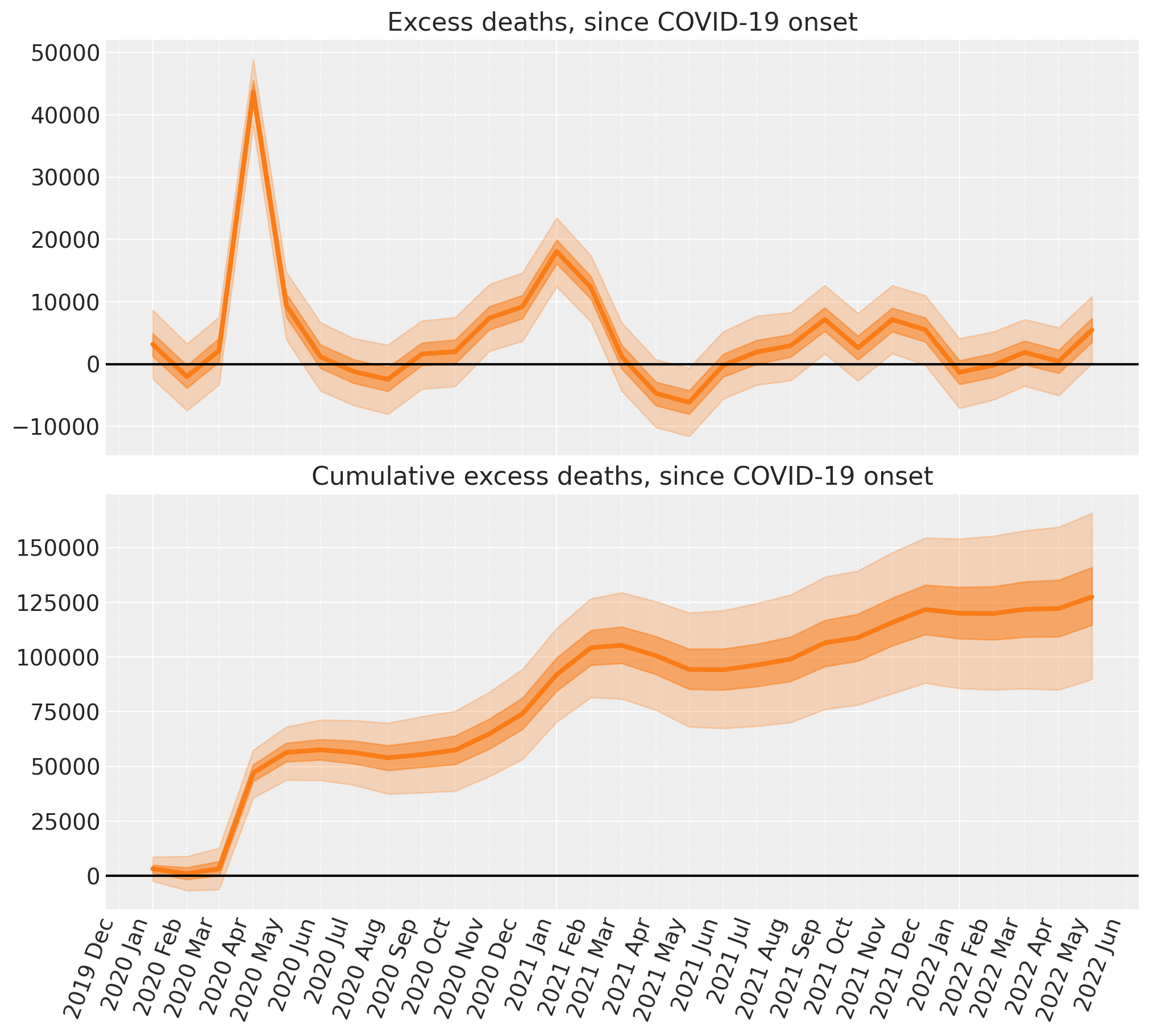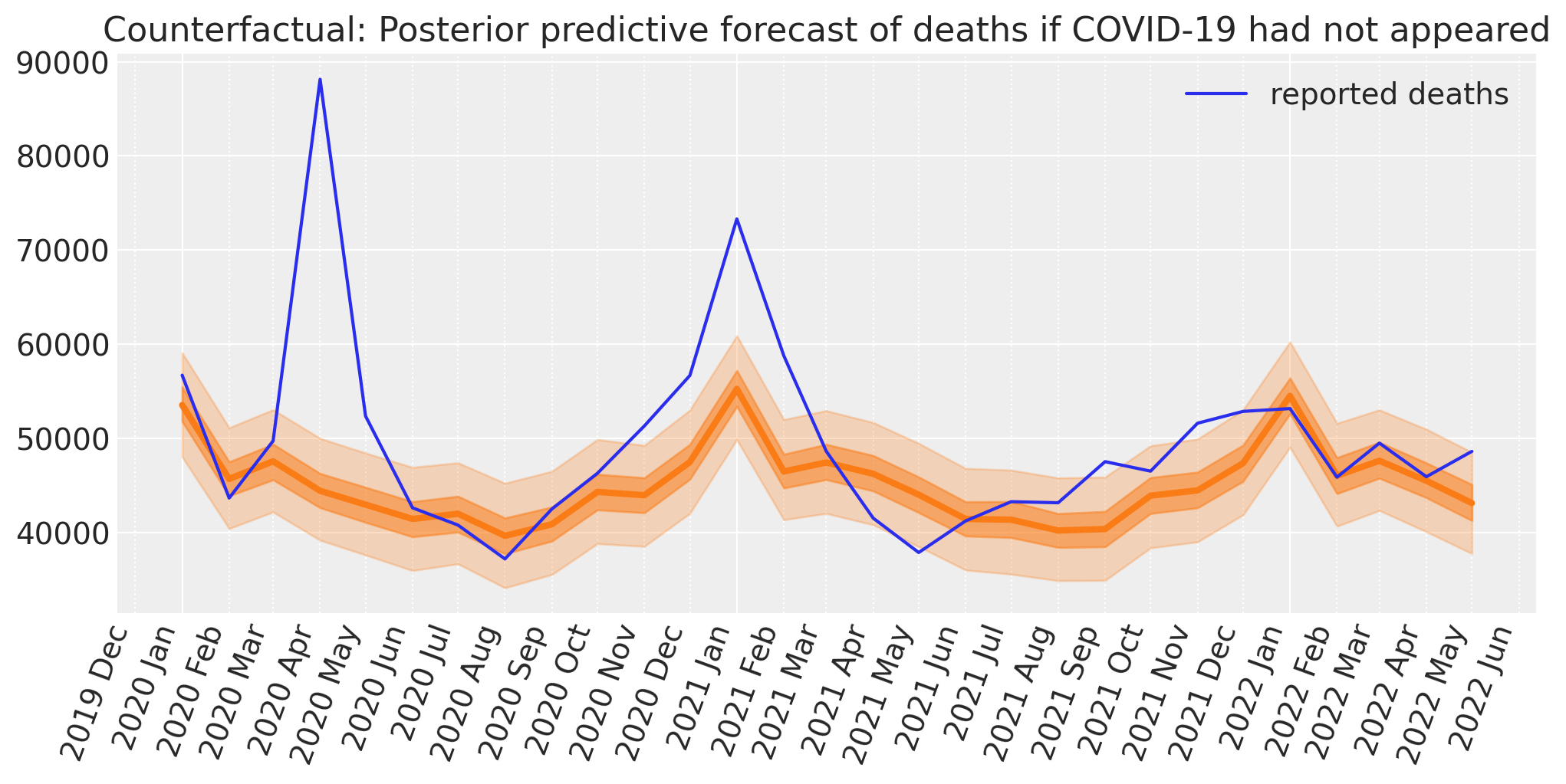 We now have the ingredients needed to calculate excess deaths. Namely, the reported number of deaths, and the Bayesian counterfactual prediction of how many would have died if nothing had changed from the pre to post COVID-19 era.