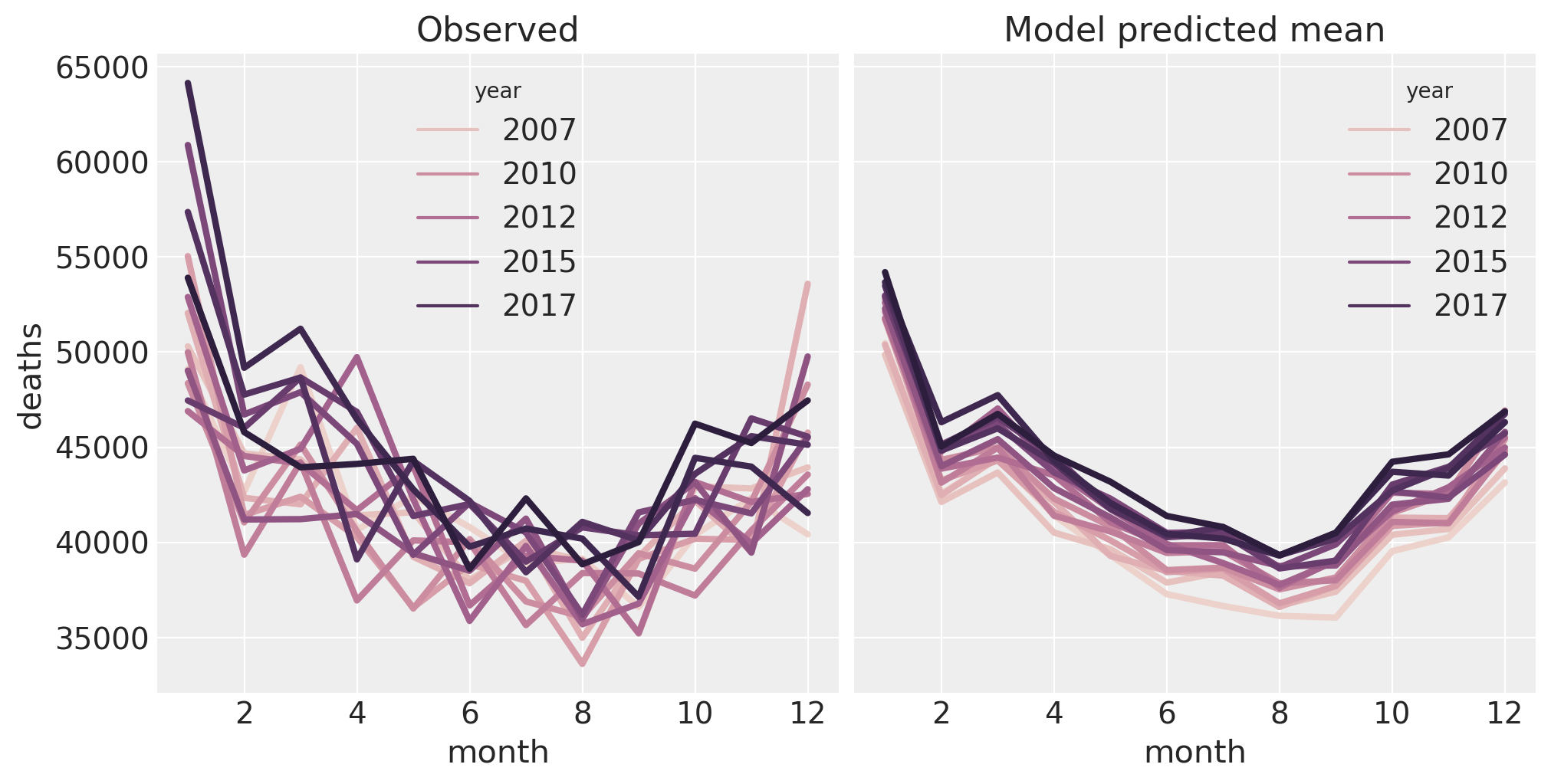 The model is doing a pretty good job of capturing the properties of the data. On the right, we can clearly see the main effects of month and year. However, we can see that there is something interesting happening in the data (left) in January which the model is not capturing. This might be able to be captured in the model by adding an interaction between month and year, but this is left as an exercise for the reader.