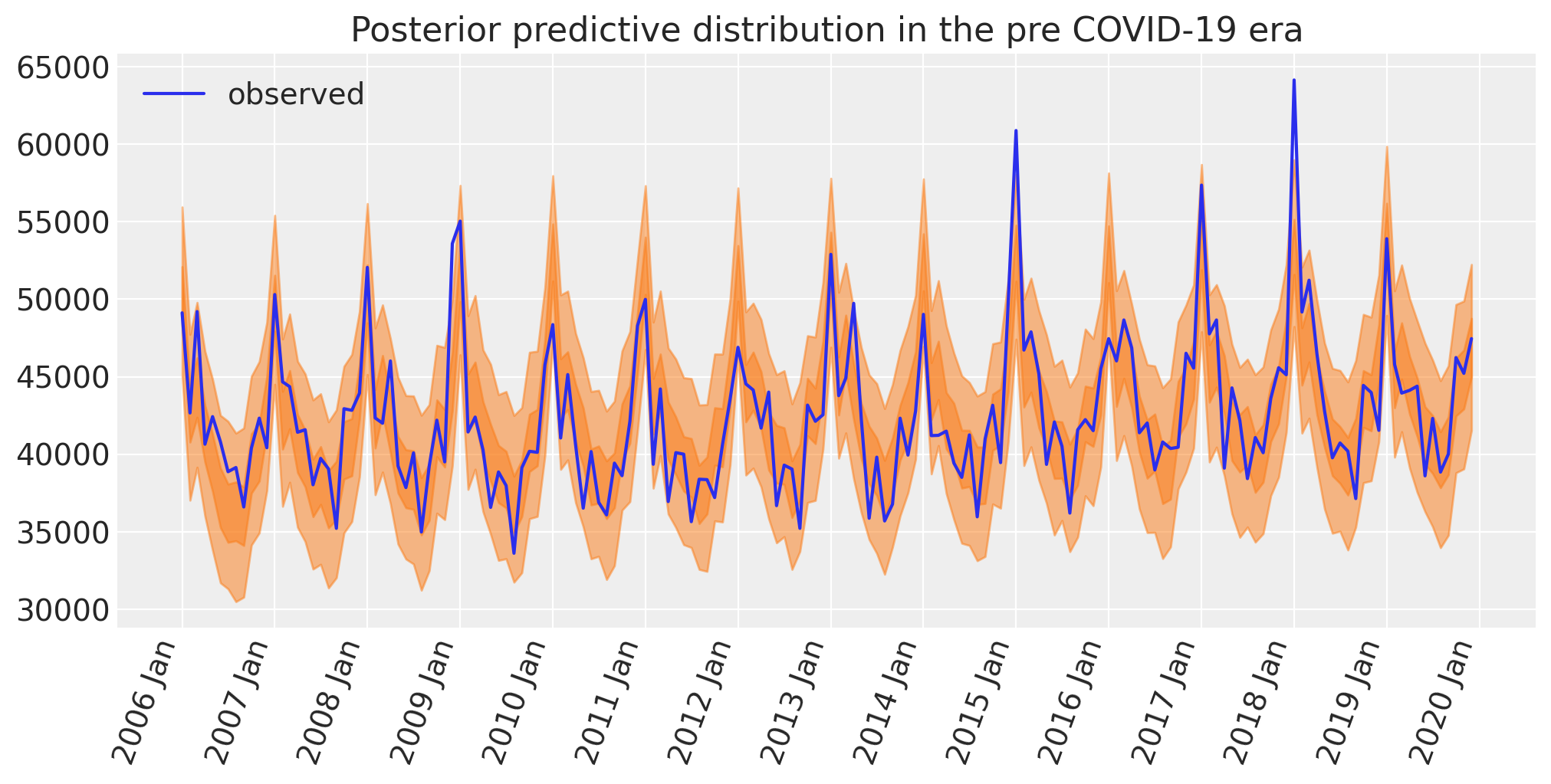 predataset.Retrodict the number of deaths expected by the model in the pre COVID-19 period. This is not a counterfactual, but acts to tell us how capable the model is at accounting for the already observed data.