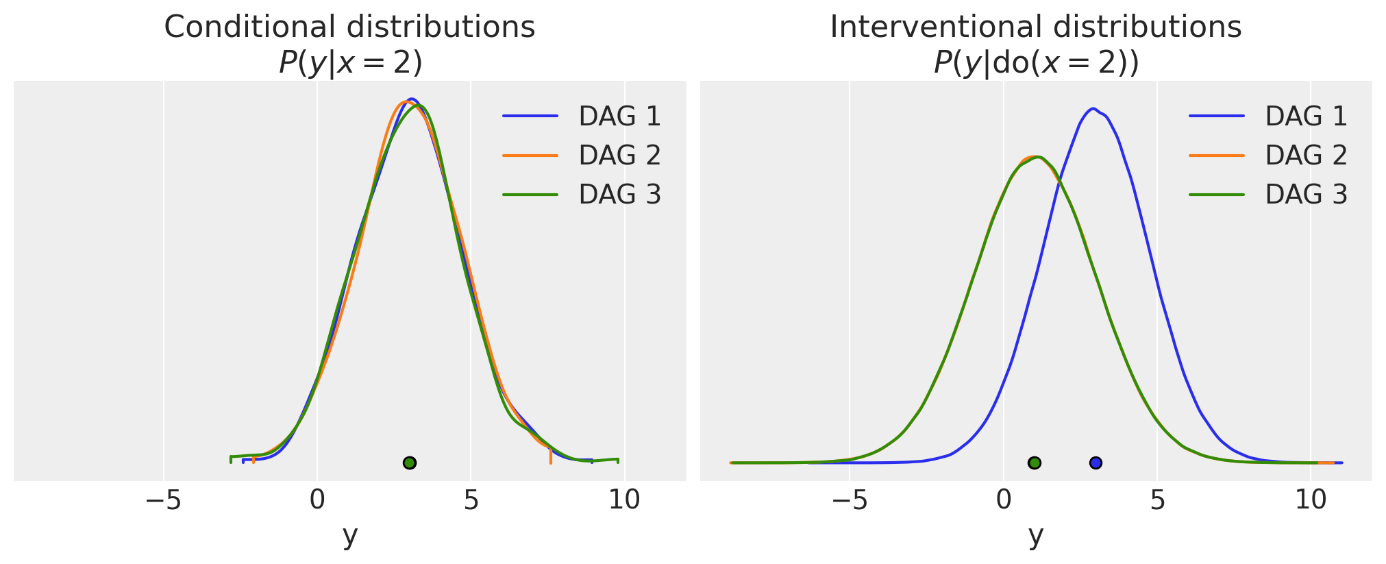 \(P(y|\operatorname{do}(x=2))\) for DAG 2 and DAG 3 will actually be the same in this contrived example because the details were arranged to arrive at the same marginal distribution \(P(y)\) for all DAGs.