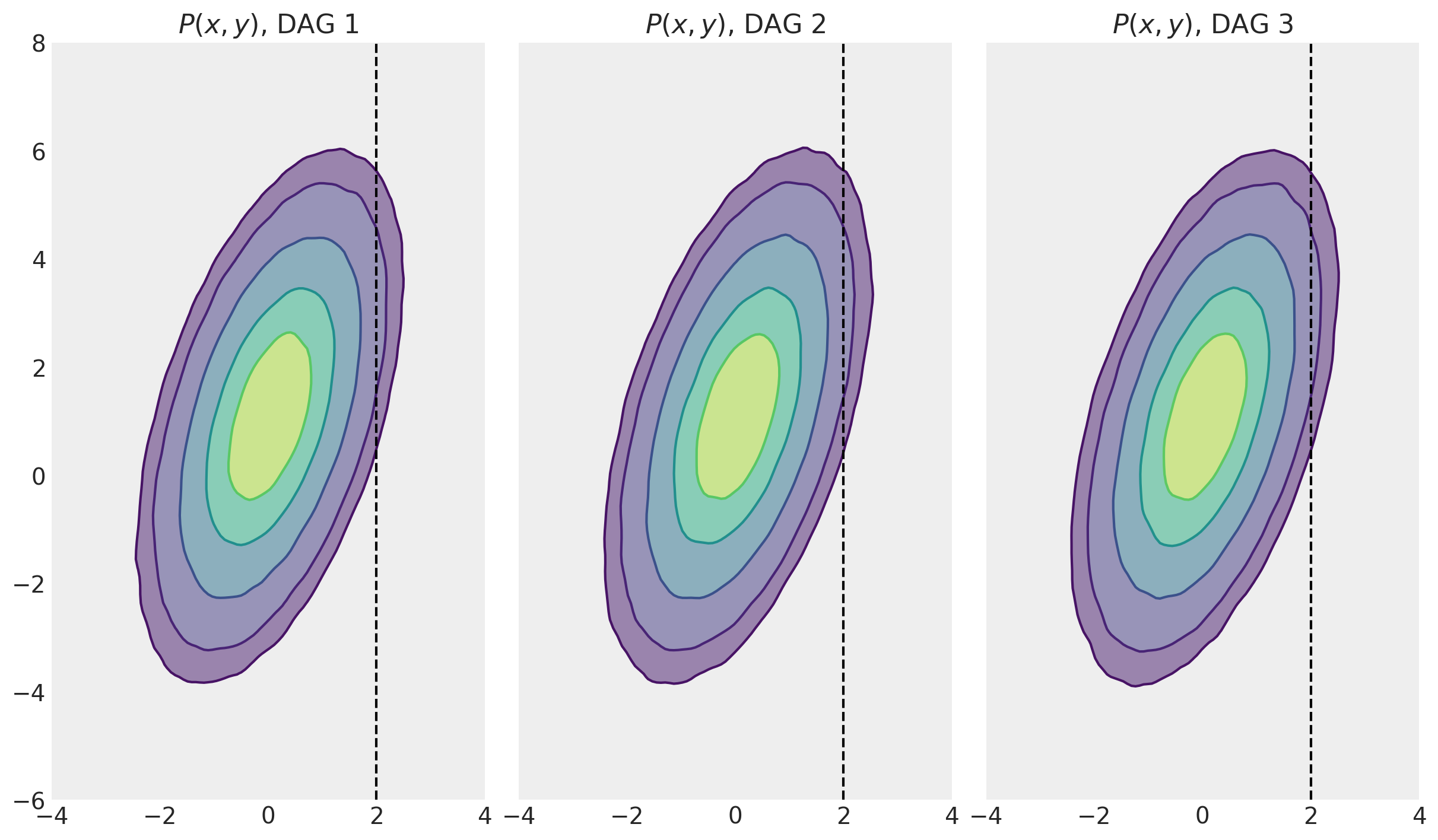 First, let’s take a look at the joint distributions for each of the DAGs to convince ourselves that these are actually the same.
