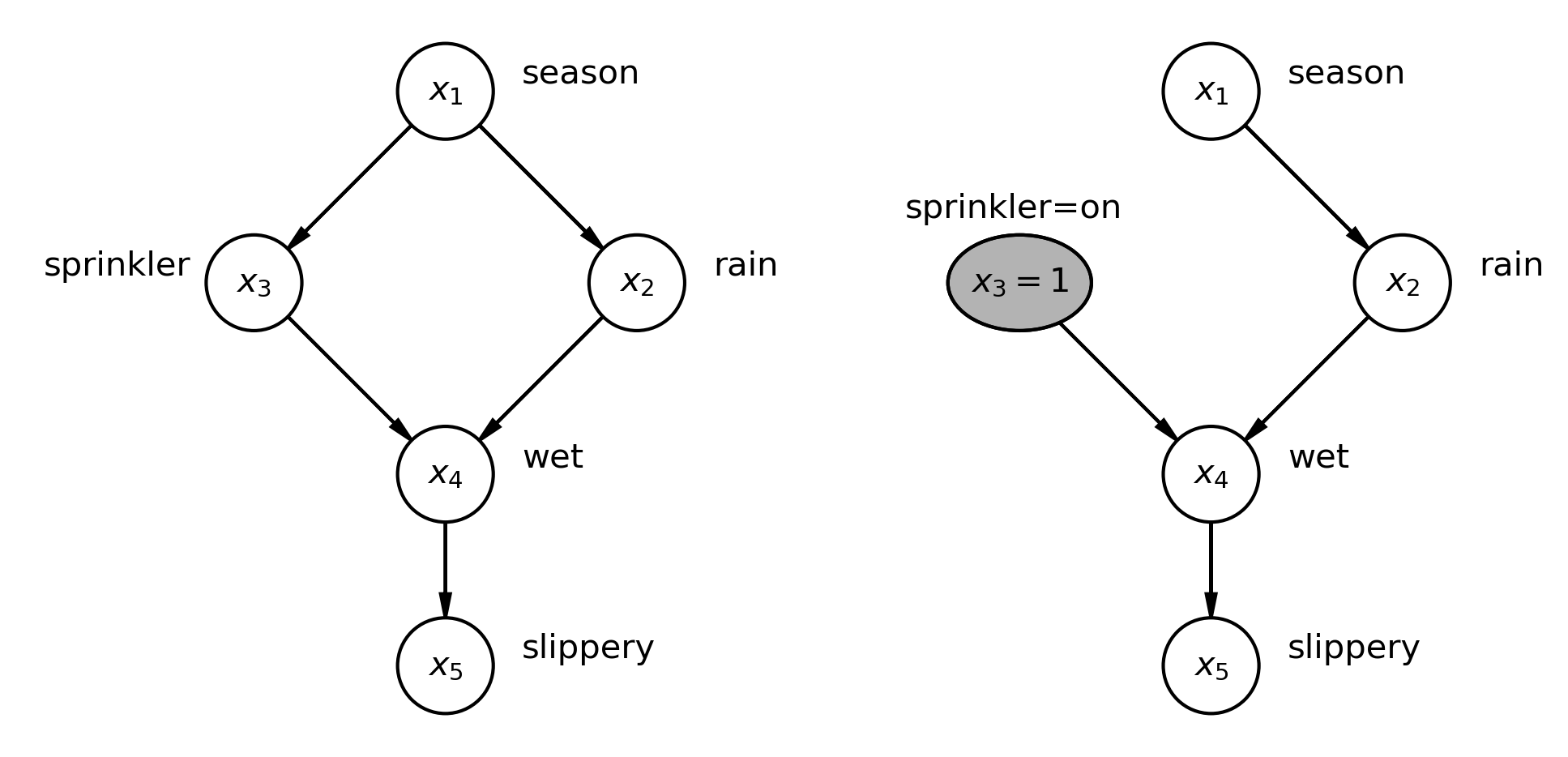 On the right of the figure we have applied the \(\operatorname{do}\) operator to examine what will happen if we set the sprinkler to be on. You can see that we have now set the value of that node, \(x_3=1\) and we have removed the incoming edge (influence) of season, meaning that once we turn on the sprinkler manually, it’s not influenced by the season anymore.