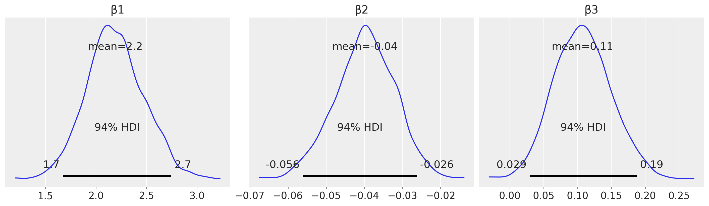 az.plot_posterior(result, var_names=["β1", "β2", "β3"], figsize=(14, 4));