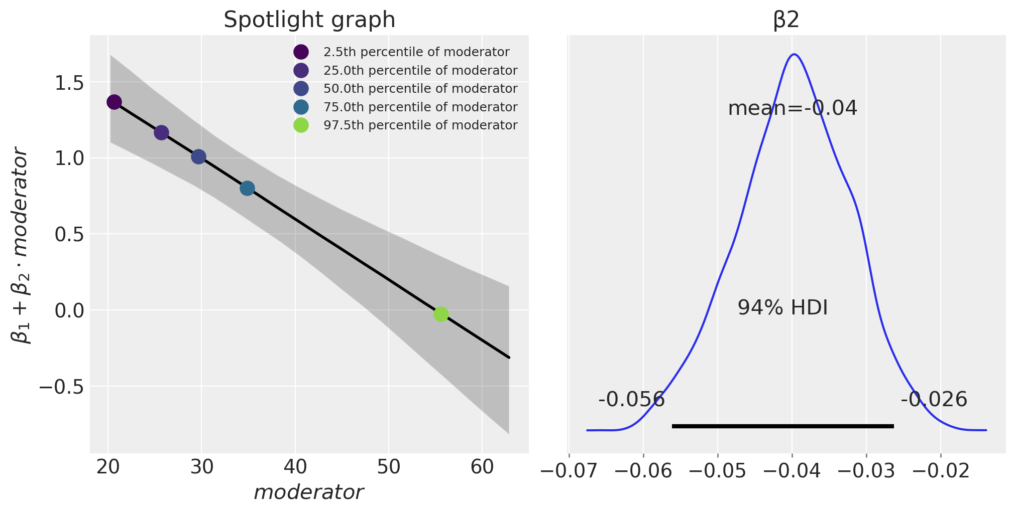 Further information about the ‘moderation effect’, or what McClelland et al. [2017] called a spotlight graphs, can be found in Bauer and Curran [2005] and Spiller et al. [2013]. Although these papers take a frequentist (not Bayesian) perspective.