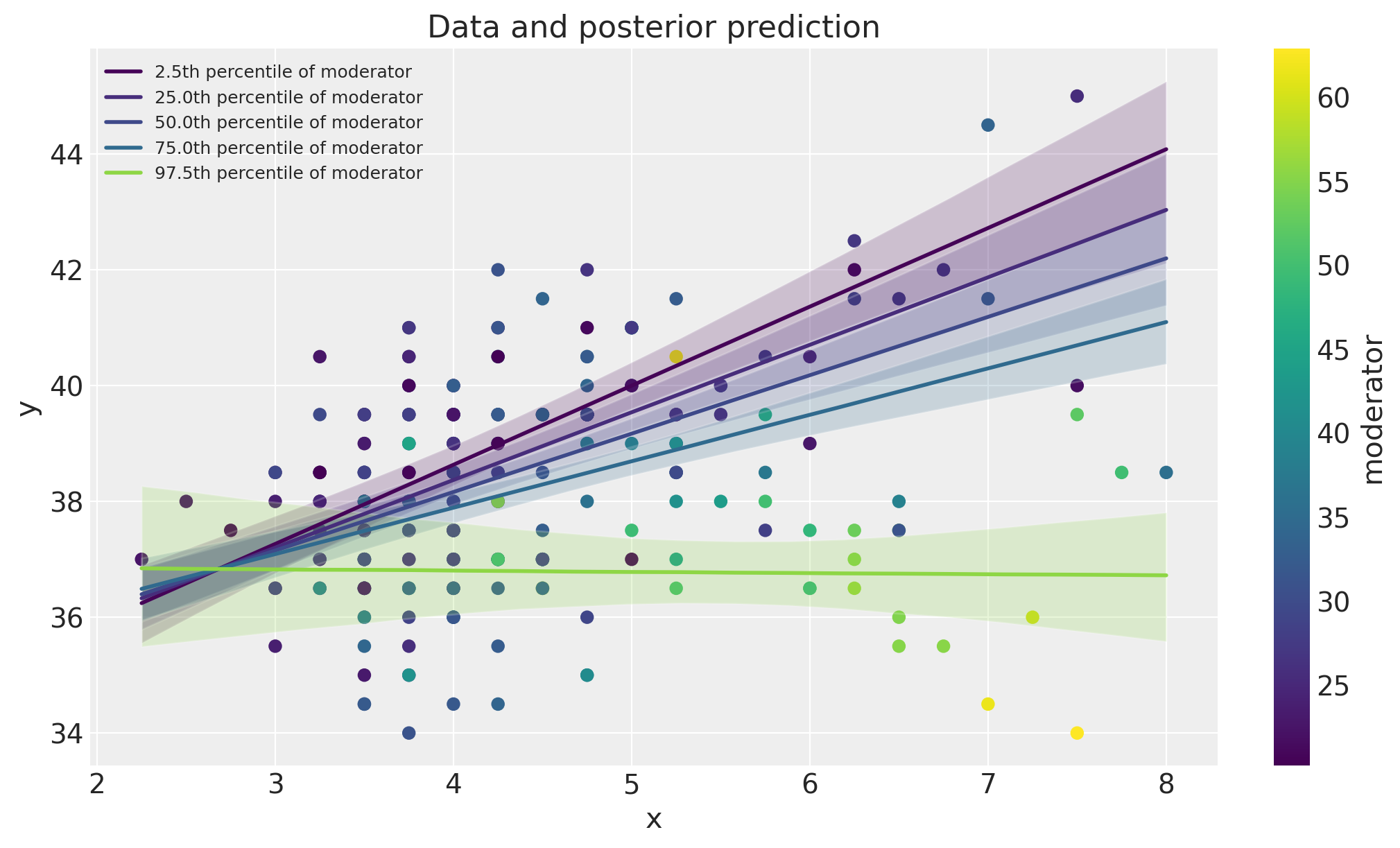 Note that this is sometimes mixed up with mediation analysis. Mediation analysis is appropriate when we believe the effect of a predictor variable upon an outcome variable is (partially, or fully) mediated through a 3rd mediating variable. Readers are referred to the textbook by Hayes [2017] as a comprehensive (albeit Frequentist) guide to moderation and related models as well as the PyMC example Bayesian mediation analysis.