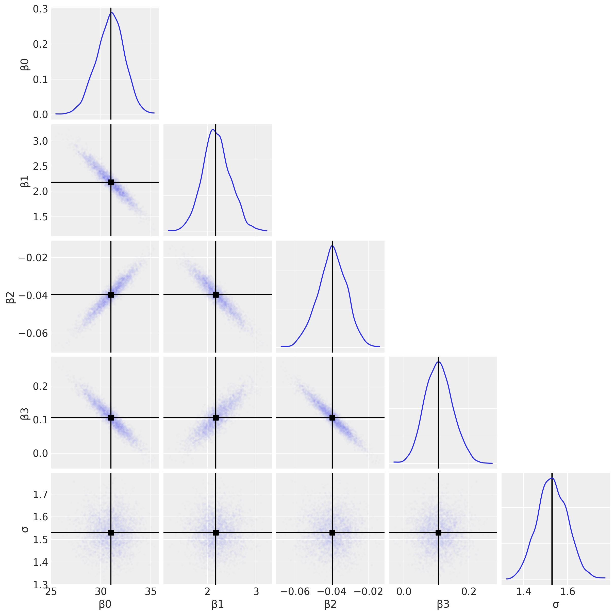 First we will use a pair plot to look at joint posterior distributions. This might help us identify any estimation issues with the interaction term (see the discussion below about multicollinearity).