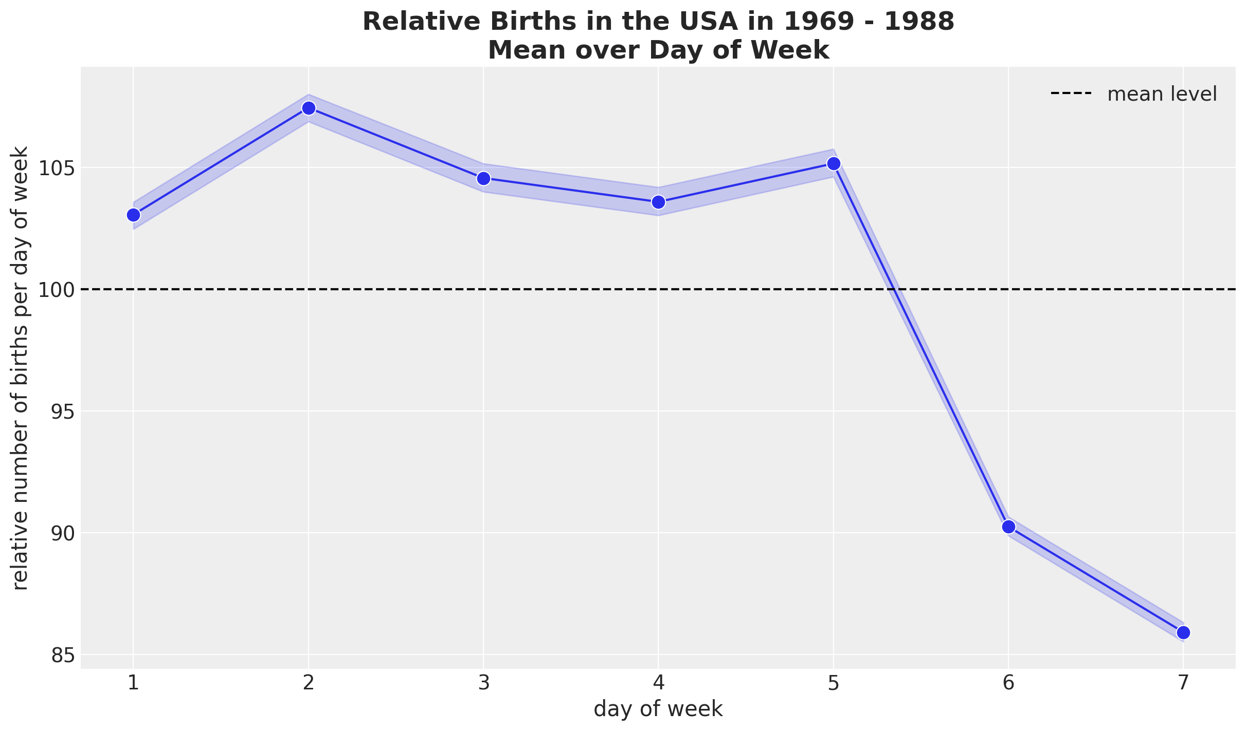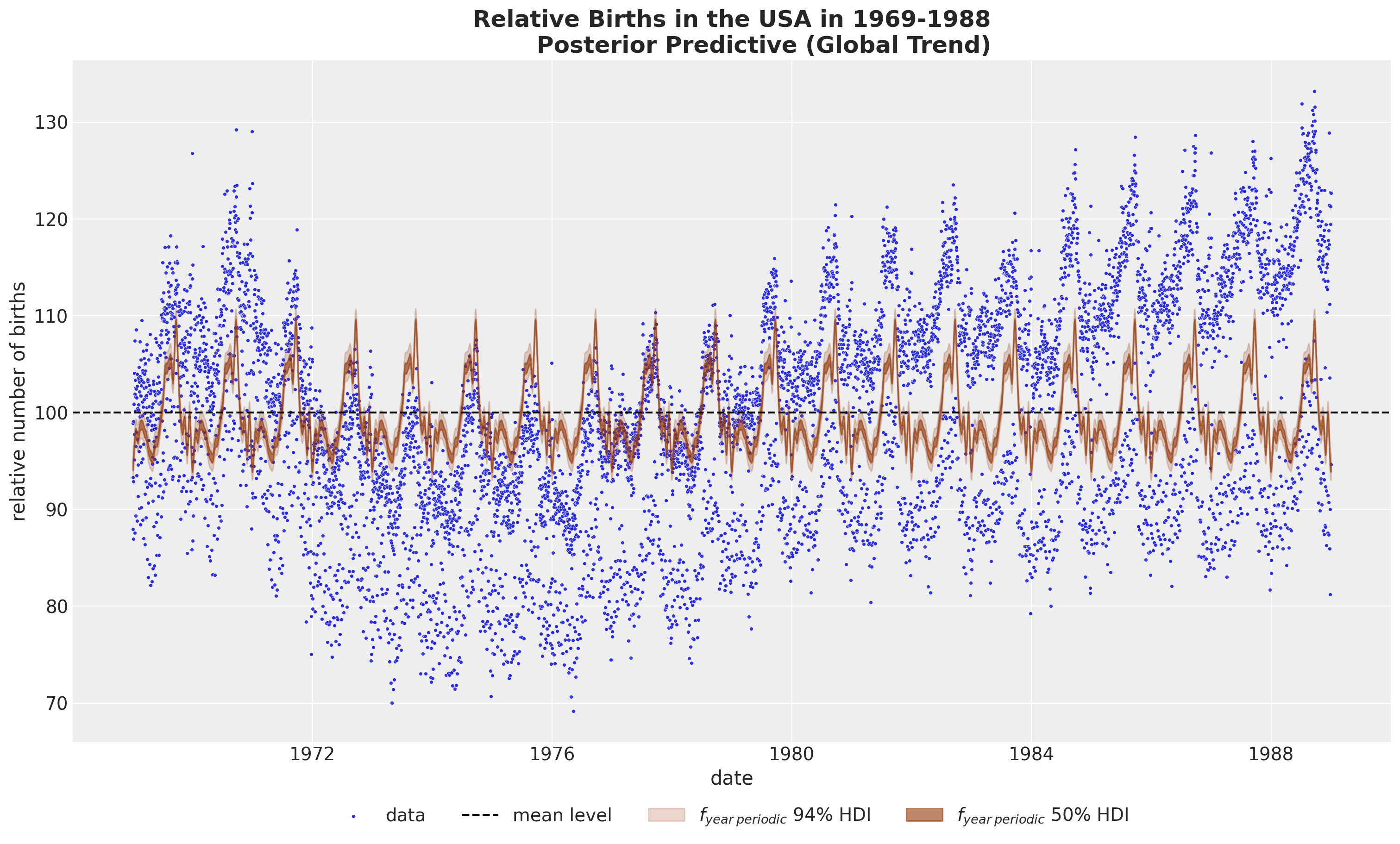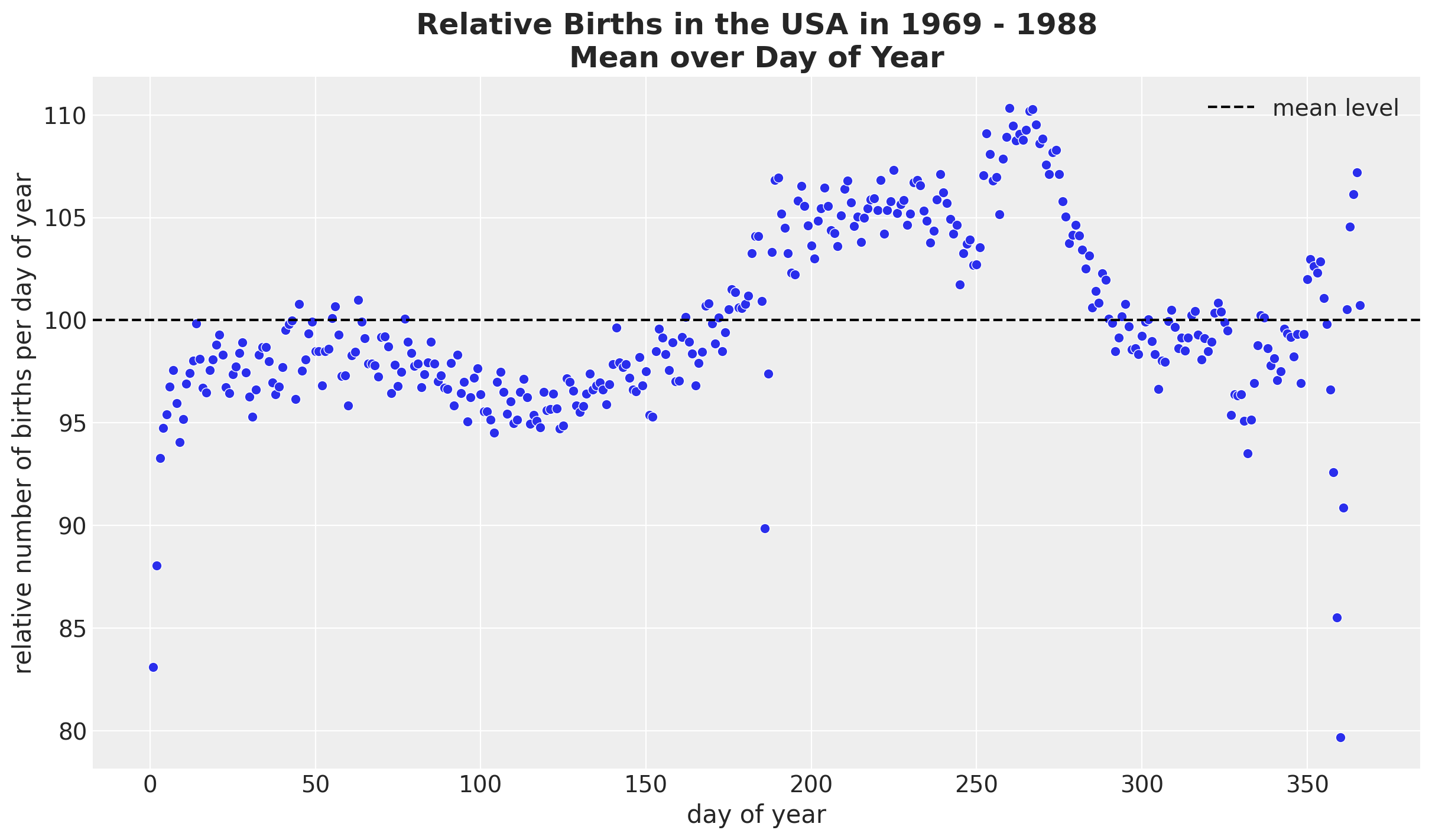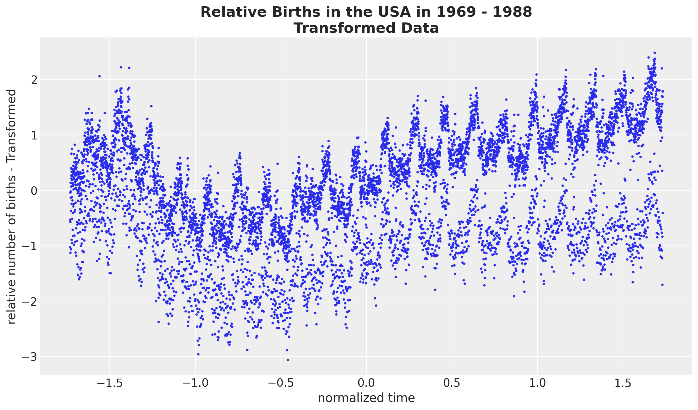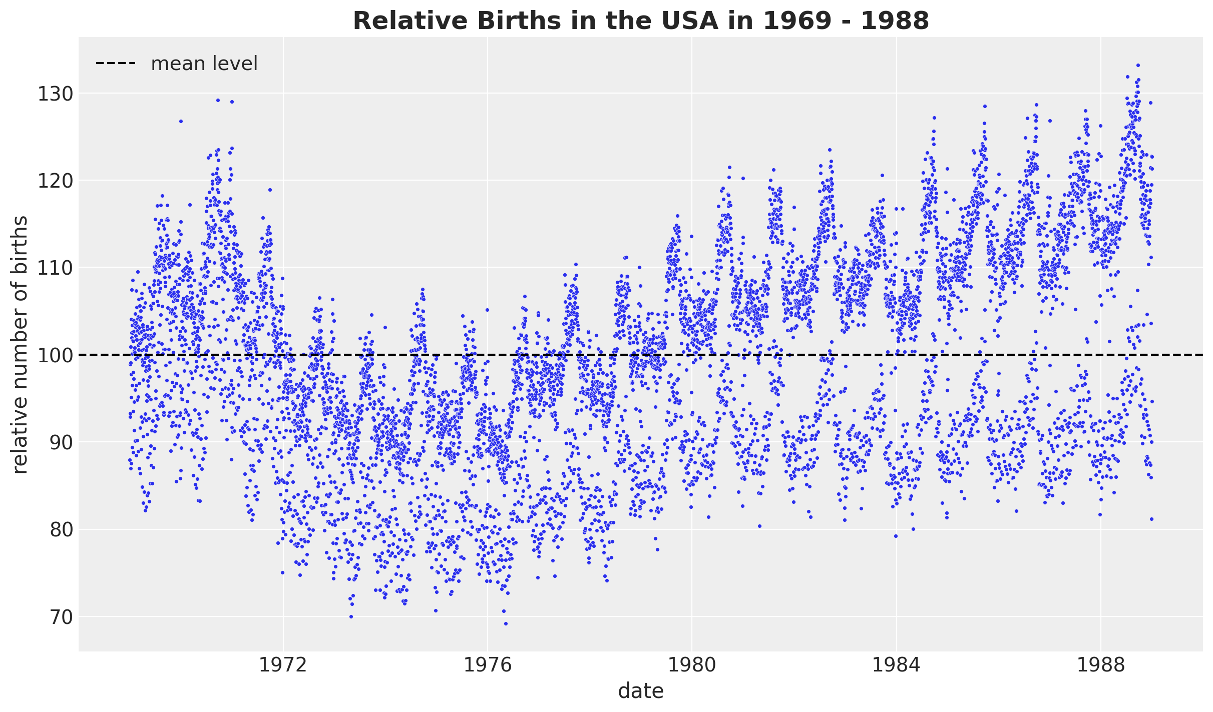 To illustrate the main concepts, we use the classic birthdays example dataset (see [Gelman et al., 2013] [Chapter 21] and here for a comment on the data source) and reproduce one of the models presented in the excellent case study [Vehtari, 2022] by Aki Vehtari (you can find the Stan code on this repository). In his exposition, the author presents an extensive iterative approach to analyze the relative number of births per day in the USA from 1969-1988 using HSGPs for various components: the long-term trend, seasonal, weekly, day the year, and special floating day variation. As this resource is very detailed and gives many relevant explanations, we do not reproduce the whole process but instead focus on reproducing one of the intermediate models. Namely, the model with a slow trend, yearly seasonal trend, and day-of-week components (Model 3 in the original case study). The reason for reproducing a simpler model than the final one is to make this an introductory notebook for users willing to learn about this technique. We will provide a subsequent example where we implement the final model with all components.