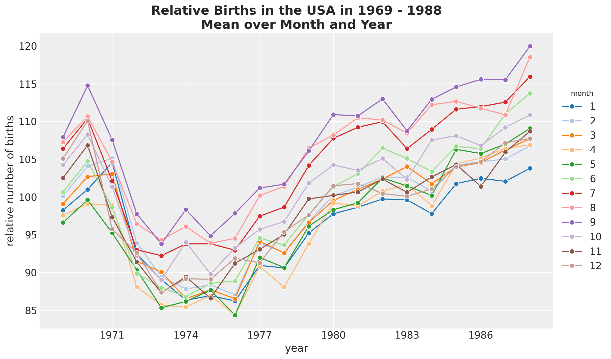 label="Relative Births in the USA in 1969 - 1988\nMean over Day of Year",