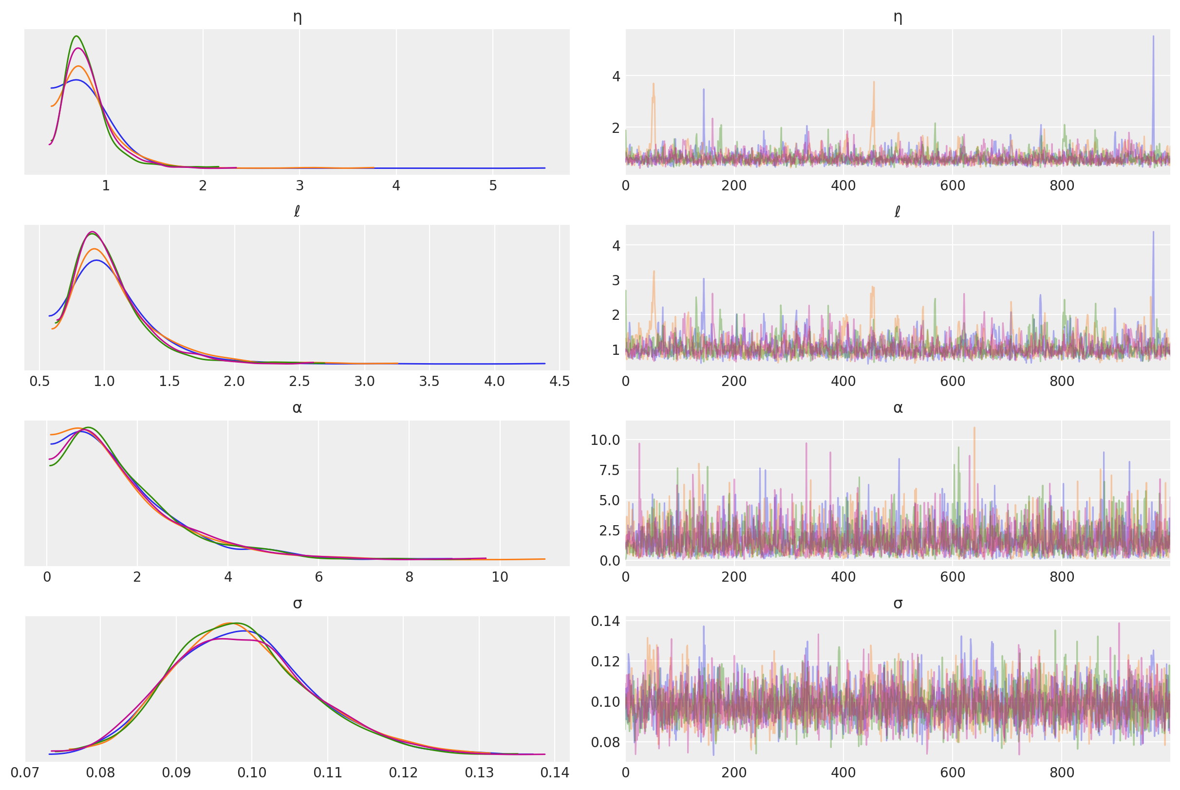 az.plot_trace(tr, var_names=["η", "ℓ", "α", "σ"]);