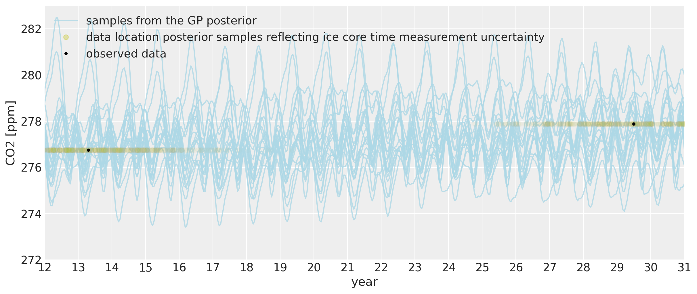 We can see that far back in time, we can backcast even the seasonal behavior to some degree. The ~two year of uncertainty in the x locations allows them to be shifted onto the nearest part of the seasonal oscillation for that year. The magnitude of the oscillation is the same as it is now in modern times. While the cycle in each of the posterior samples still has an annual period, its exact morphology is less certain since we are far in time from the dates when the Mauna Loa data was collected.