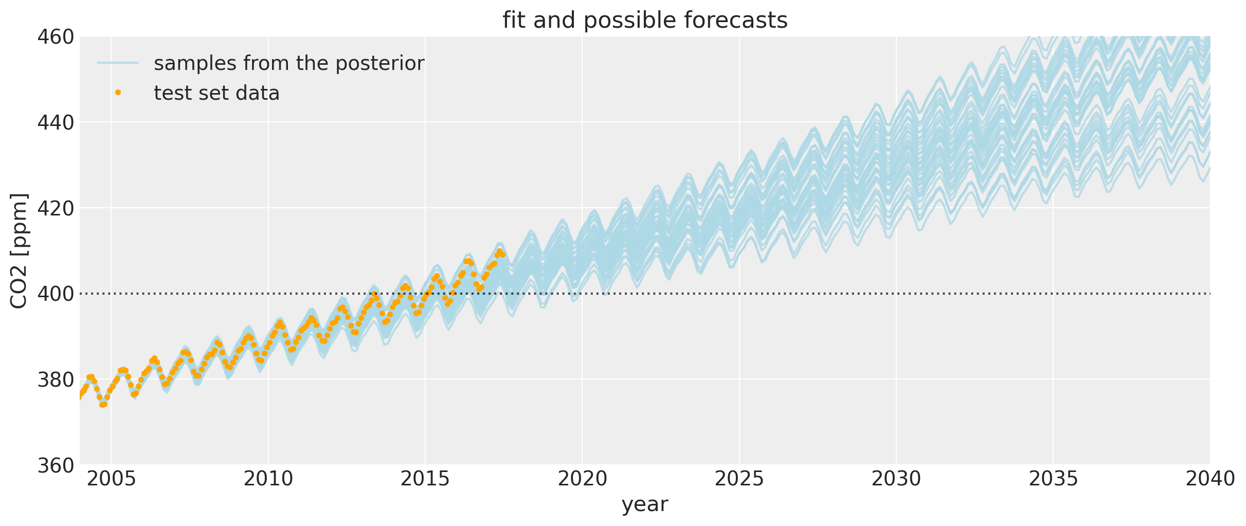 Let’s zoom in for a closer look at the uncertainty intervals at the area around when the CO2 levels first crossed 400 ppm. We can see that the posterior samples give a range of plausible future trajectories. Note that the data plotted in orange were not used in fitting the model.
