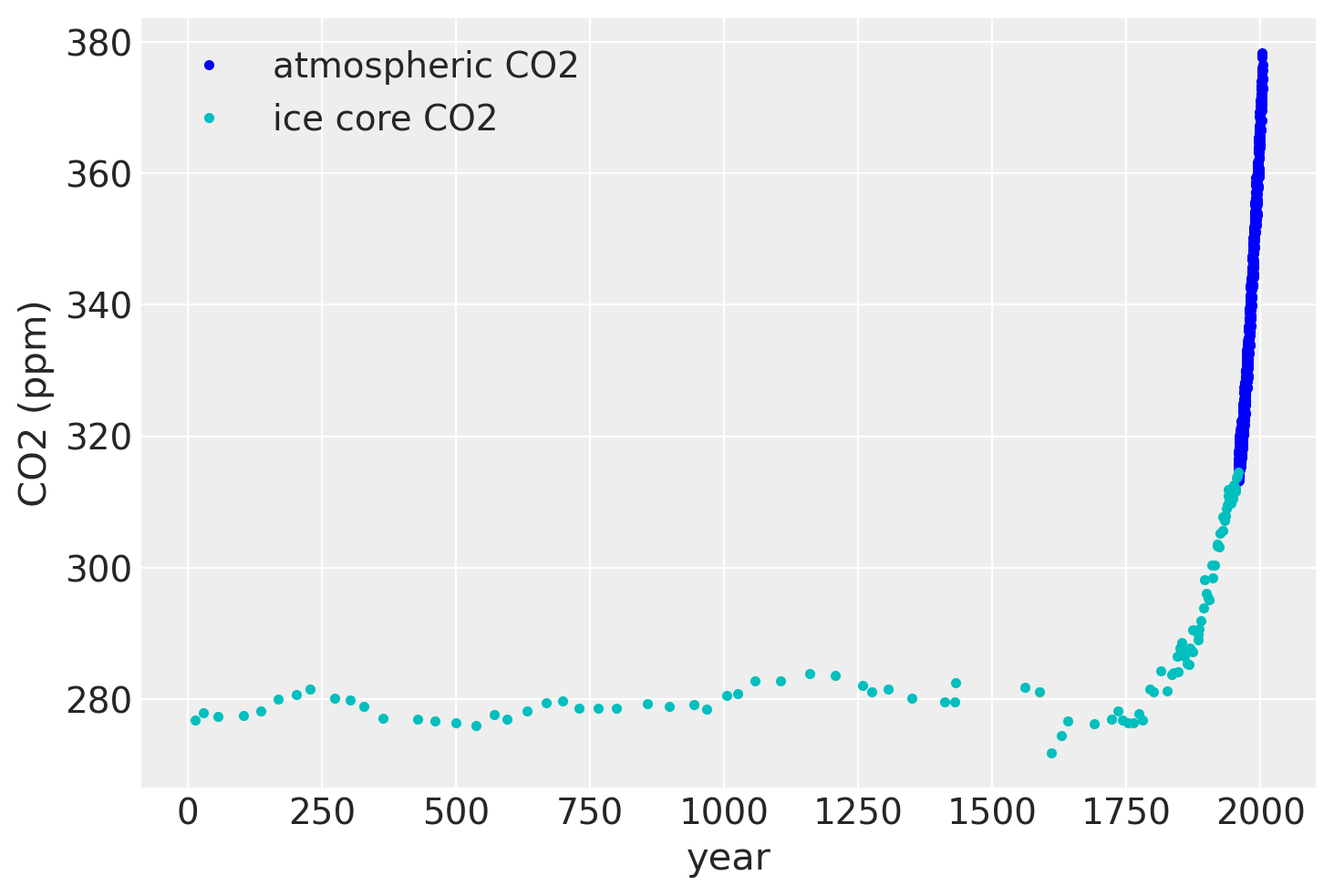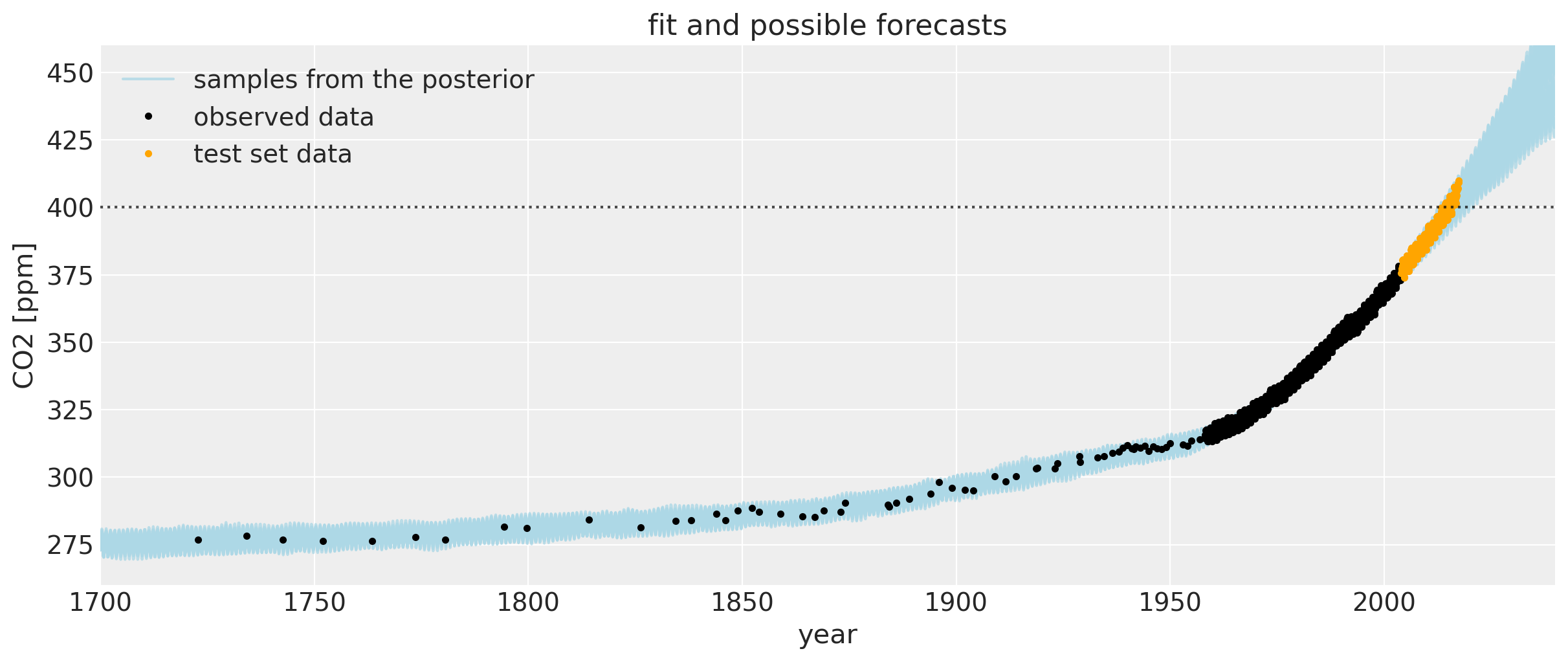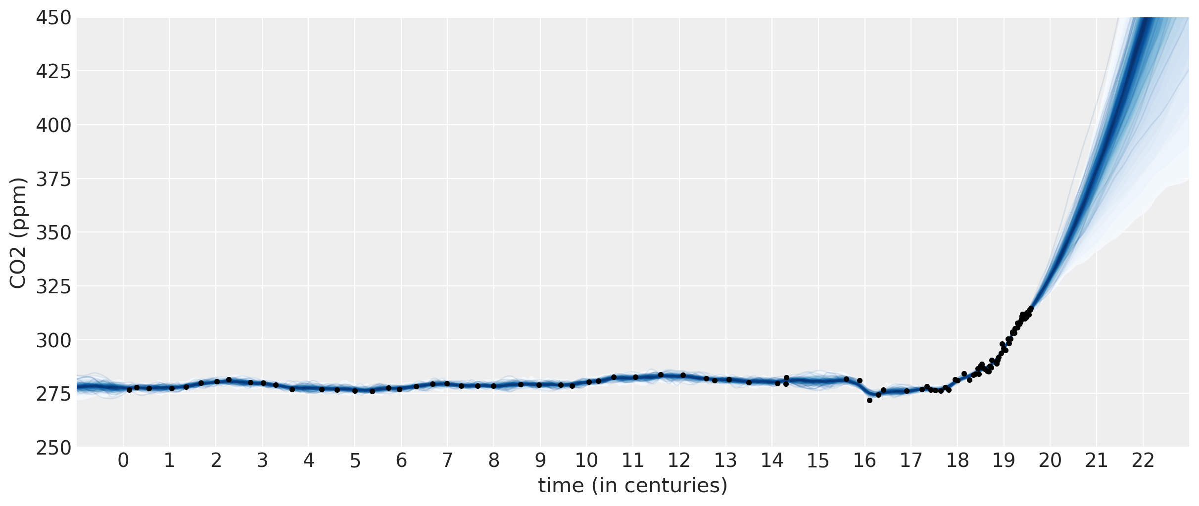 Below is a plot of the data since the 18th century (Mauna Loa and Law Dome ice core data) used to fit the model. The light blue lines are a bit hard to make out at this level of zoom, but they are samples from the posterior of the Gaussian process. They both interpolate the observed data, and represent plausible trajectories of the future forecast. These samples can alternatively be used to define credible intervals.