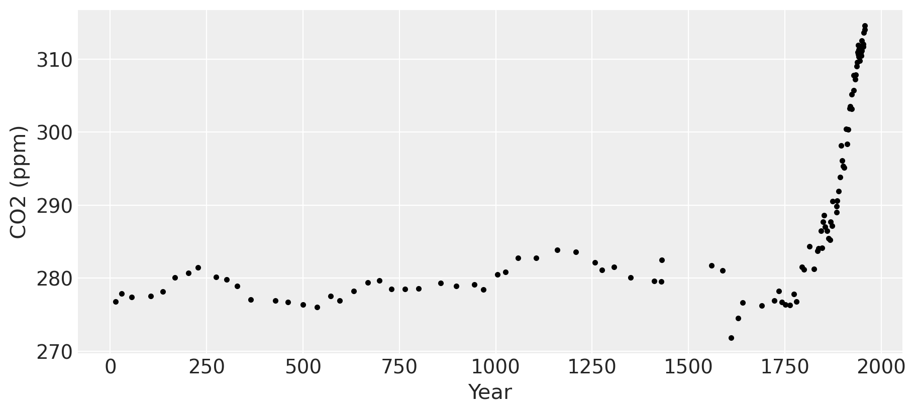 Two features are apparent in this plot. One is the little ice age, whose effects on CO2 occurs from around 1600 to 1800. The next is the industrial revolution, when people began releasing large amounts of CO2 into the atmosphere.