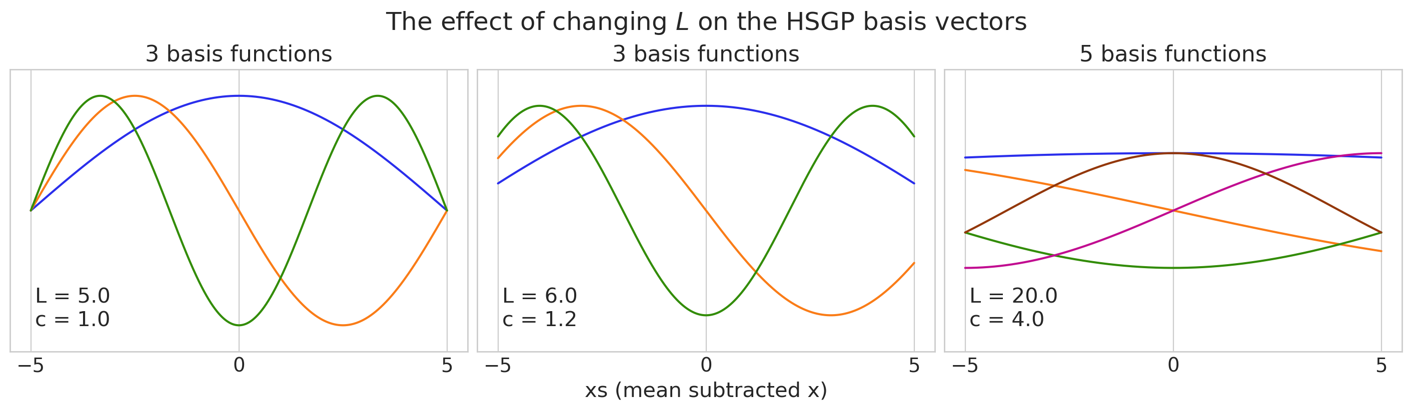 It may struggle with more rapidly varying processes. If the process you’re trying to model changes very quickly relative to the extent of the domain, the HSGP approximation may fail to accurately represent it. We’ll show in later sections how to set the accuracy of the approximation, which involves a trade-off between the fidelity of the approximation and the computational complexity.