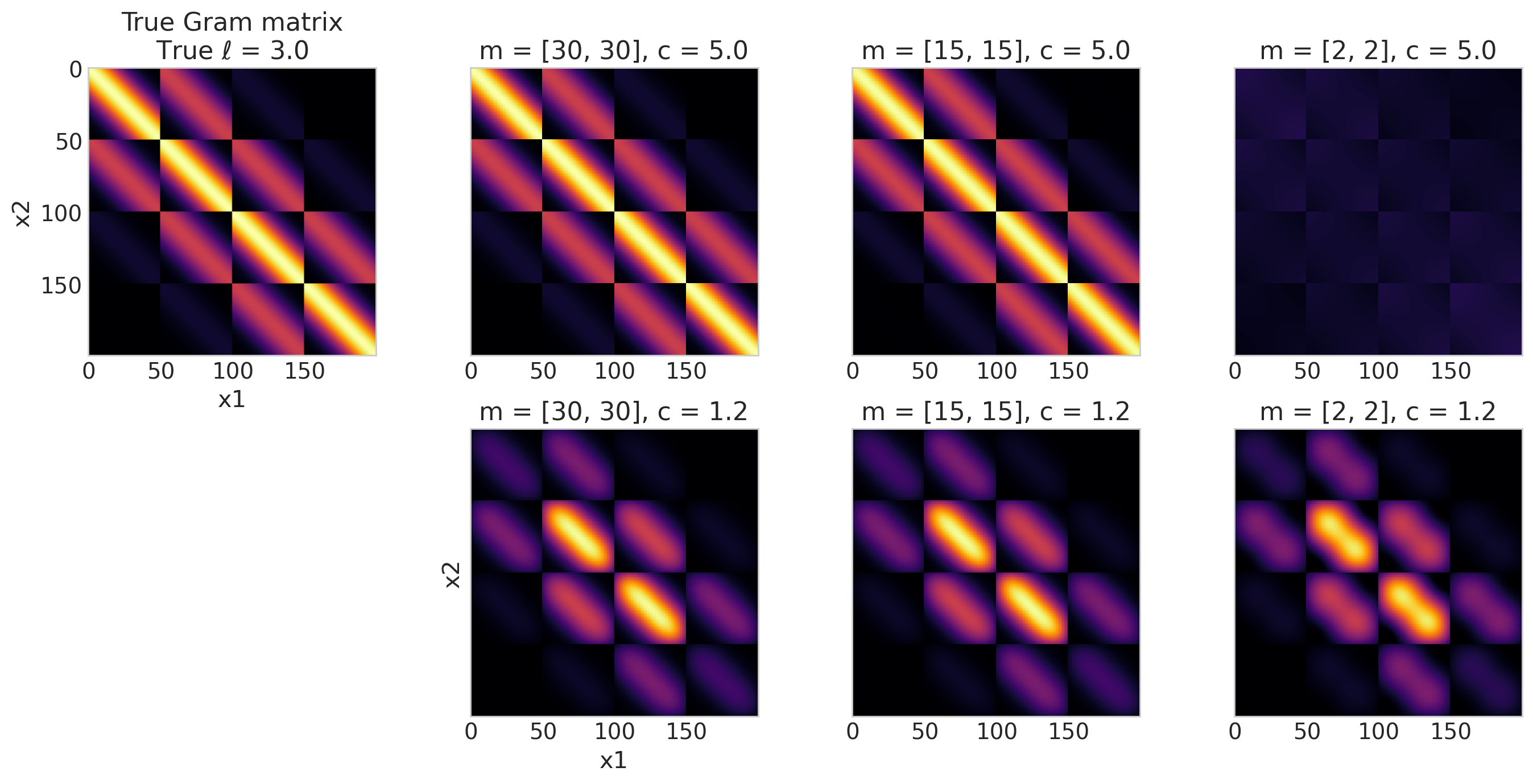 mandccontrol the approximation fidelity to computational complexity tradeoff. We’ll see in a later section how to choose these values. In short, choosing a largermhelps improve the approximation of smaller lengthscales and other short distance variations that the GP has to fit. Choosing a largerchelps improve the approximation of longer and slower changes.We chose the