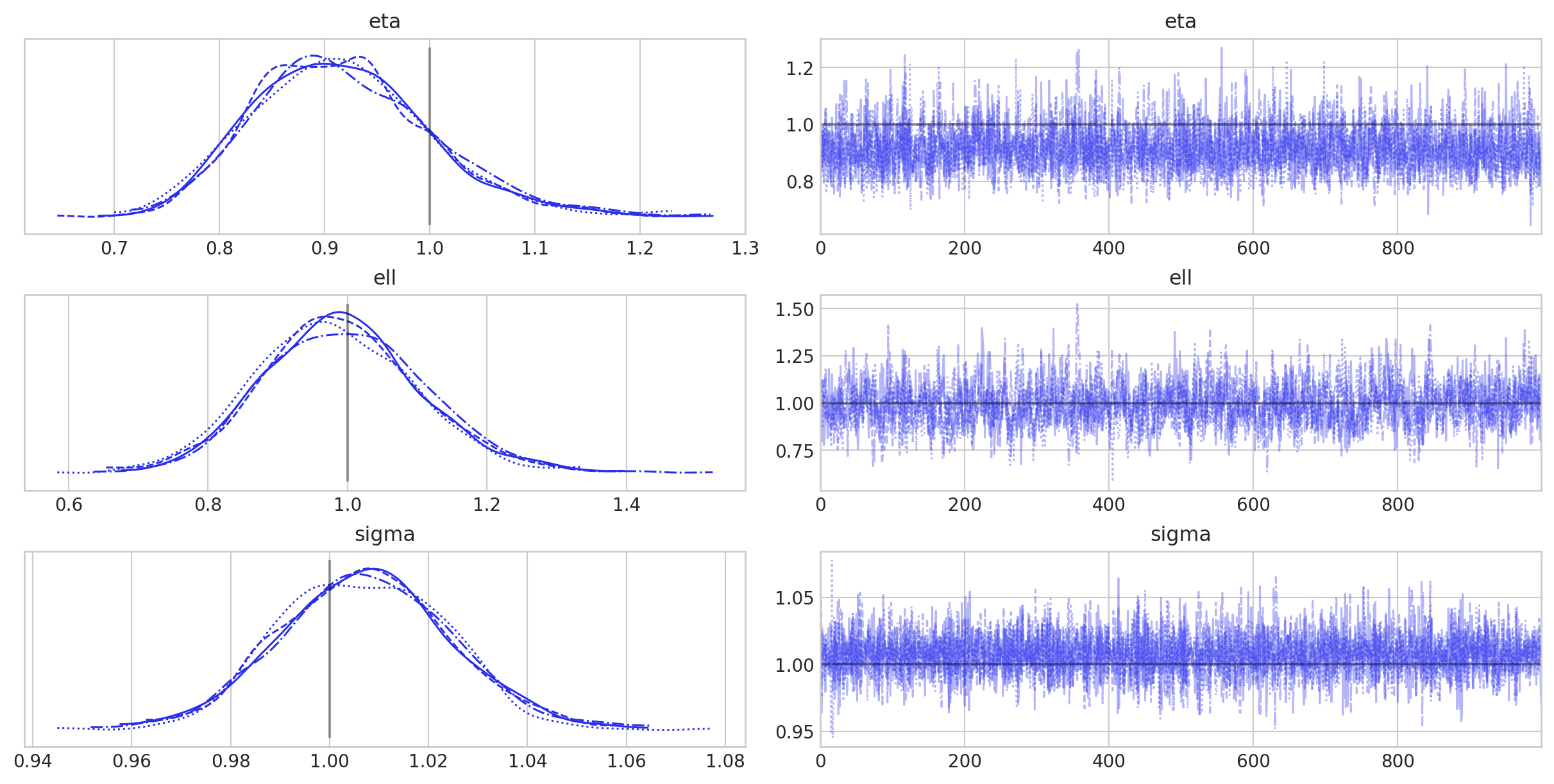 Sampling went great, but, interestingly, we seem to have a bias in the posterior for sigma. It’s not the focus of this notebook, but it’d be interesting to dive into this in a real use-case.
