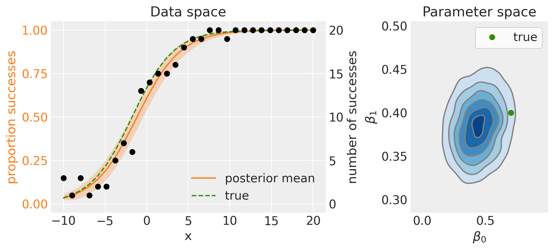 The code below plots out model predictions in data space, and our posterior beliefs in parameter space.