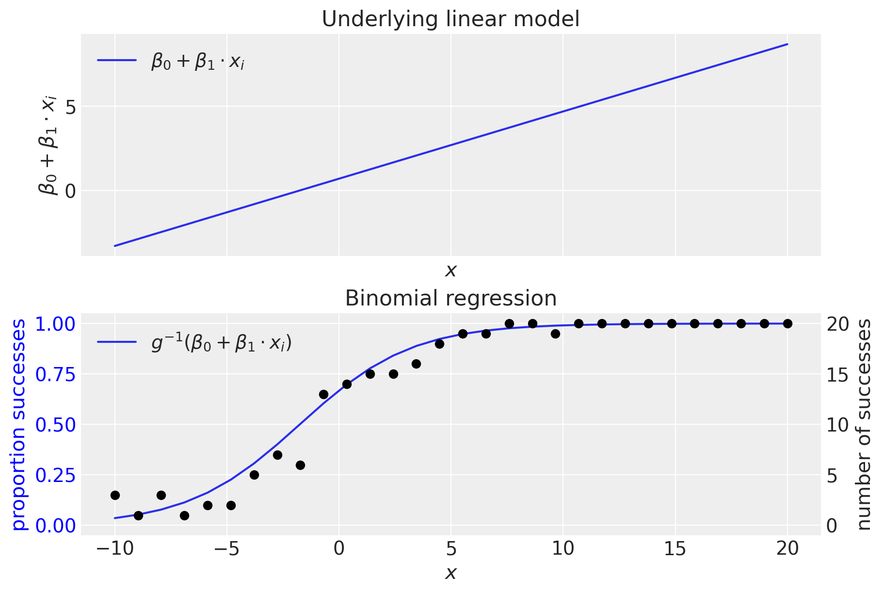 The top panel shows the (untransformed) linear model. We can see that the linear model is generating values outside the range \(0-1\), making clear the need for an inverse link function, \(g^{-1}()\) which converts from the domain of \((-\infty, +\infty) \rightarrow (0, 1)\). As we’ve seen, this is done by the inverse logistic function (aka logistic sigmoid).