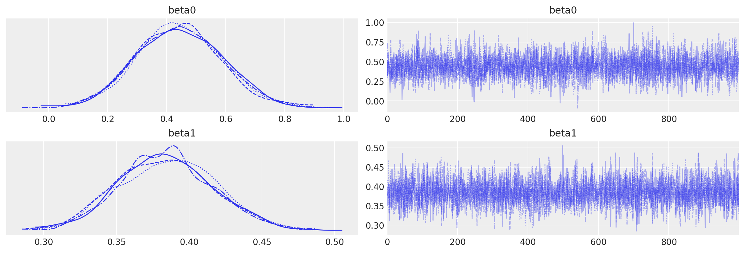 az.plot_trace(idata, var_names=["beta0", "beta1"]);
