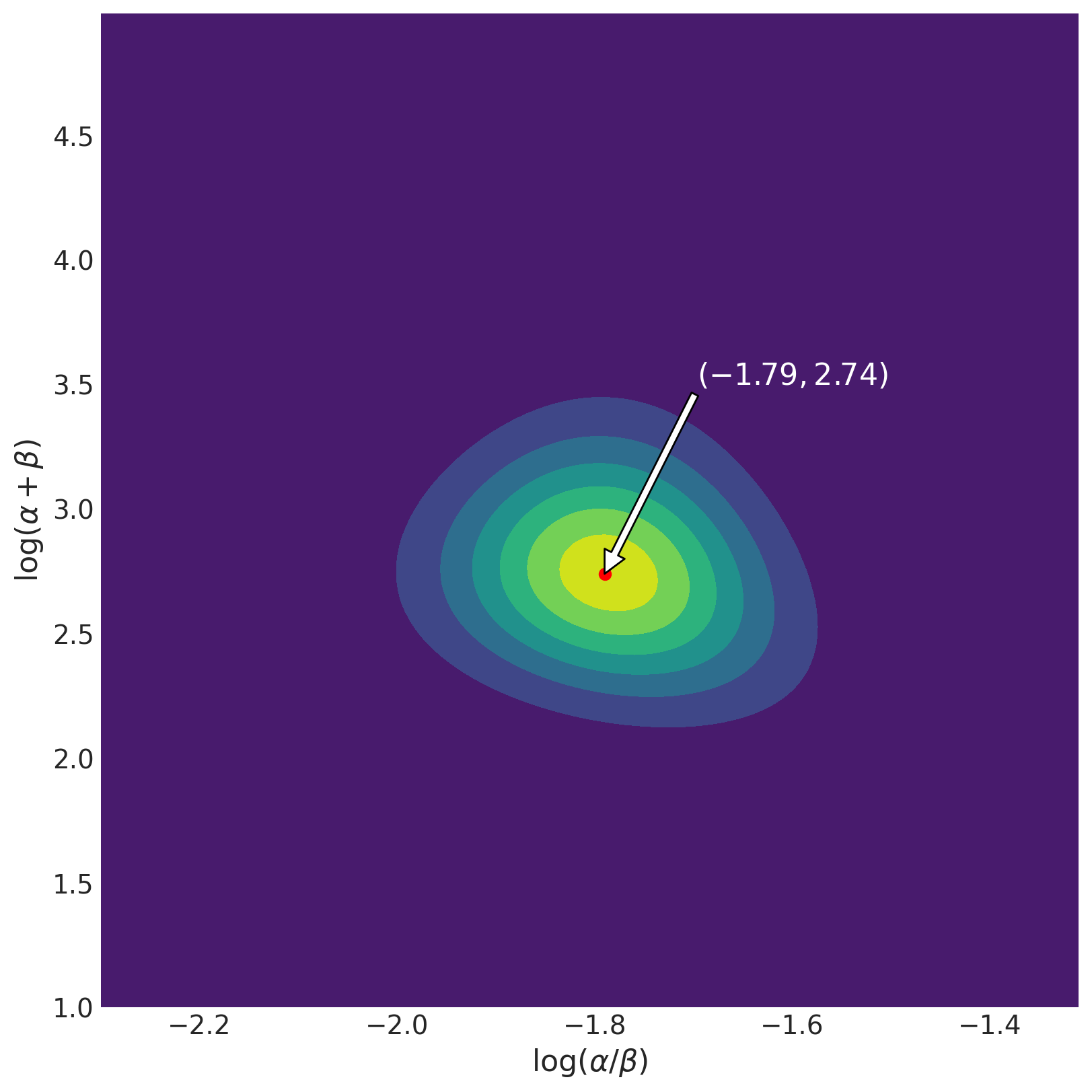 The plot shows that the posterior is roughly symmetric about the mode (-1.79, 2.74). This corresponds to \(\alpha = 2.21\) and \(\beta = 13.27\). We can compute the marginal means as the authors of BDA3 do, using