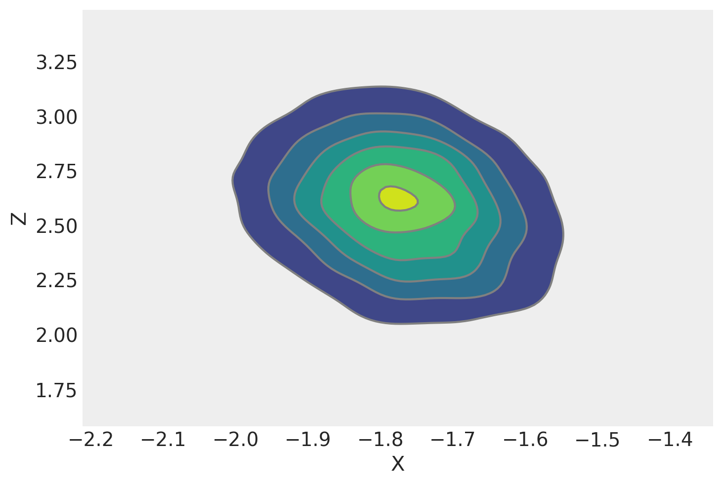 az.plot_pair(trace, var_names=["X", "Z"], kind="kde");