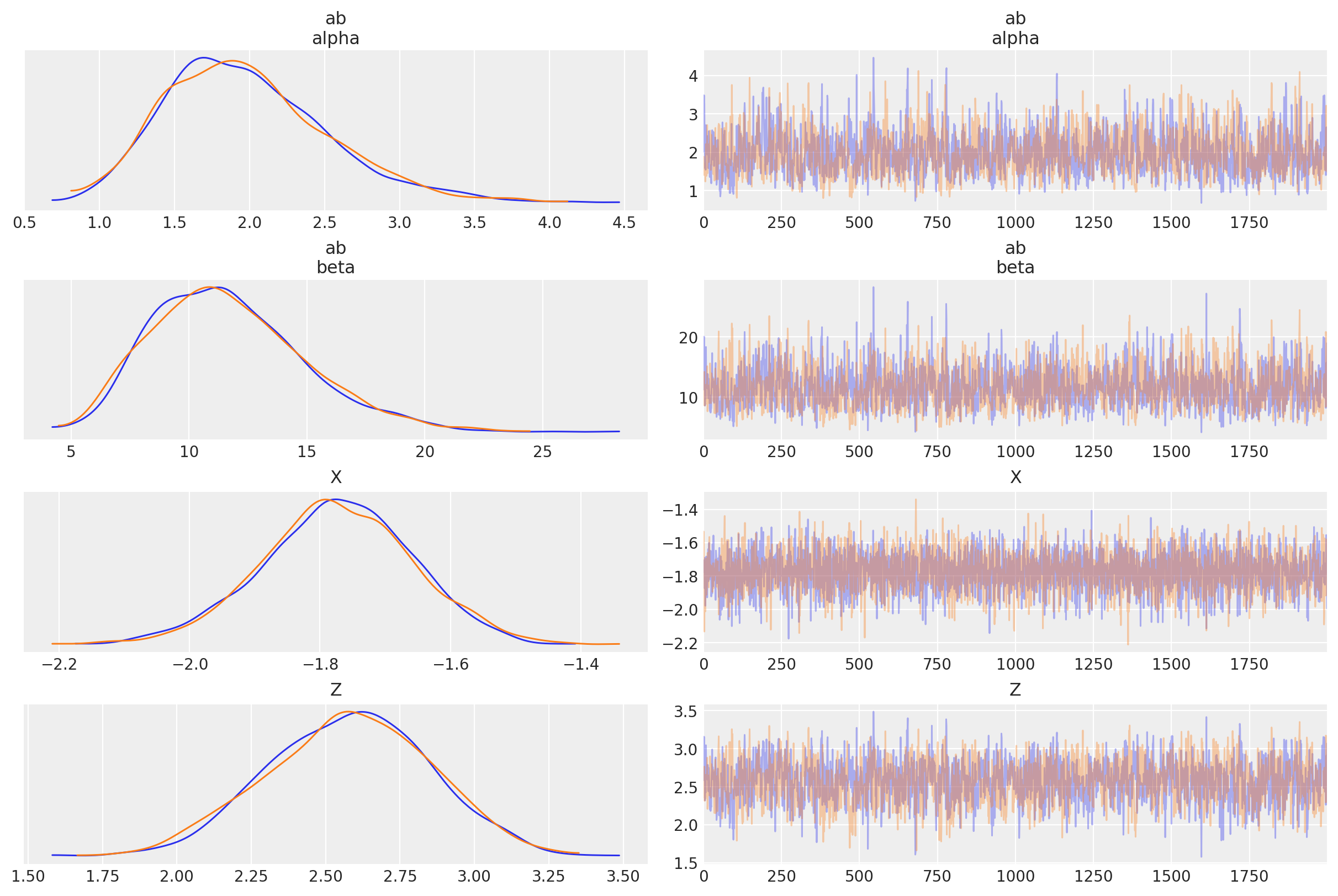 az.plot_trace(trace, var_names=["ab", "X", "Z"], compact=False);