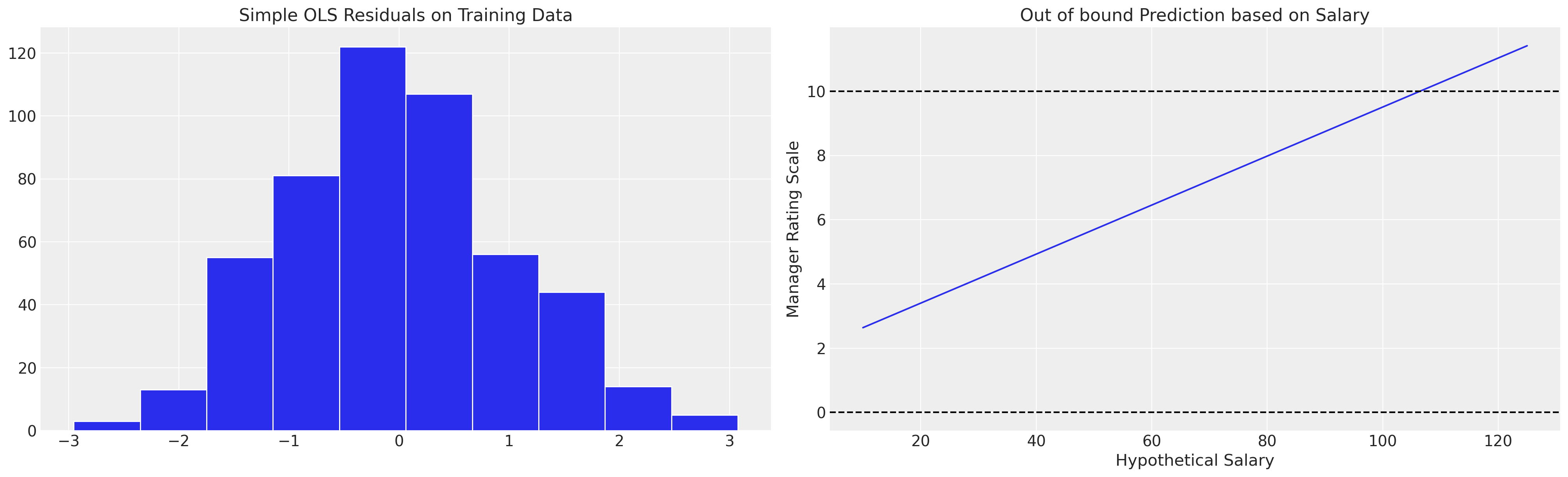 We can see here however that if we fit this model with a simple OLS fit it implies values beyond the categorical scale, which might motivate spurious salary increases by an overzealous HR manager. The OLS approximation is limited in that it cannot account for the proper nature of the outcome variable.