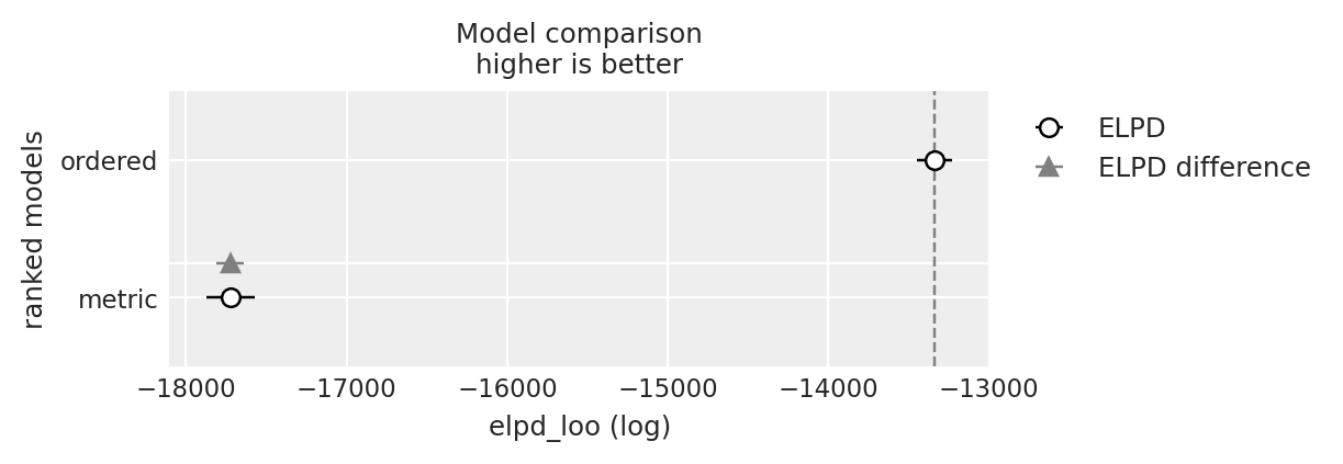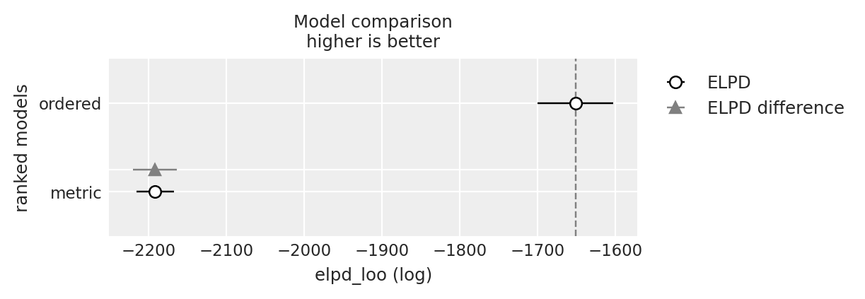 y_6_compare = az.compare({"ordered": idata_ordered, "metric": idata_normal_metric}, var_name="y_6")