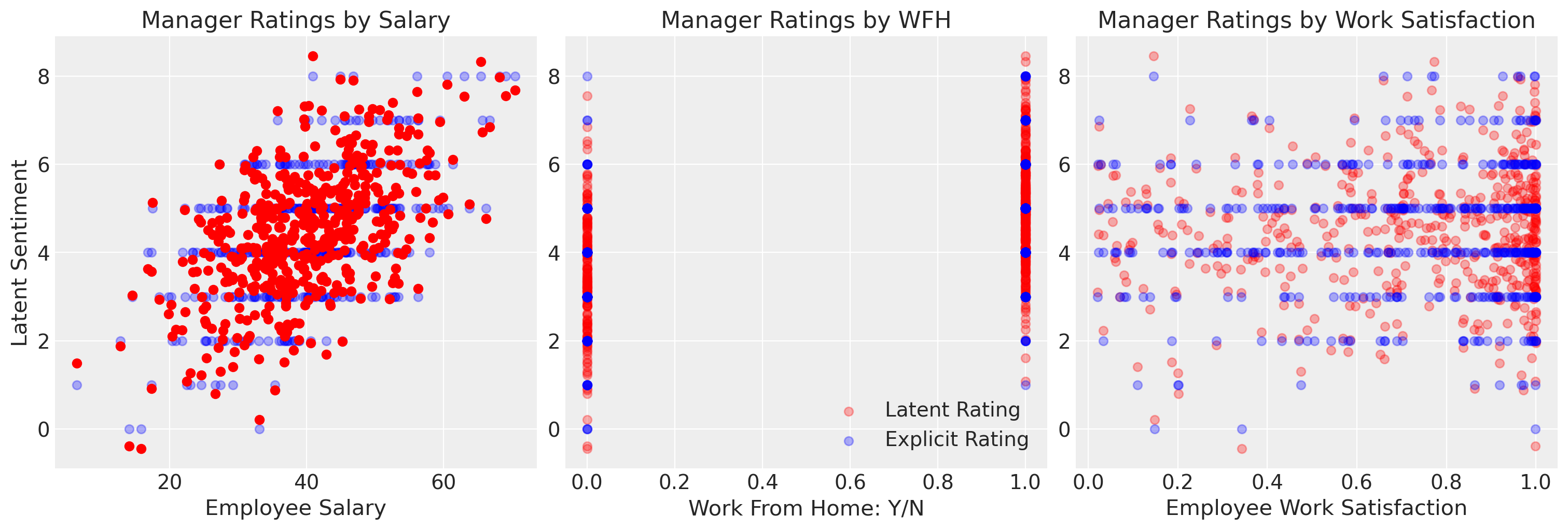 We’ve specified our data in such a way that there is an underlying latent sentiment which is continuous in scale that gets crudely discretised to represent the ordinal rating scale. We’ve specified the data in such a way that salary drives a fairly linear increase in the manager’s rating.