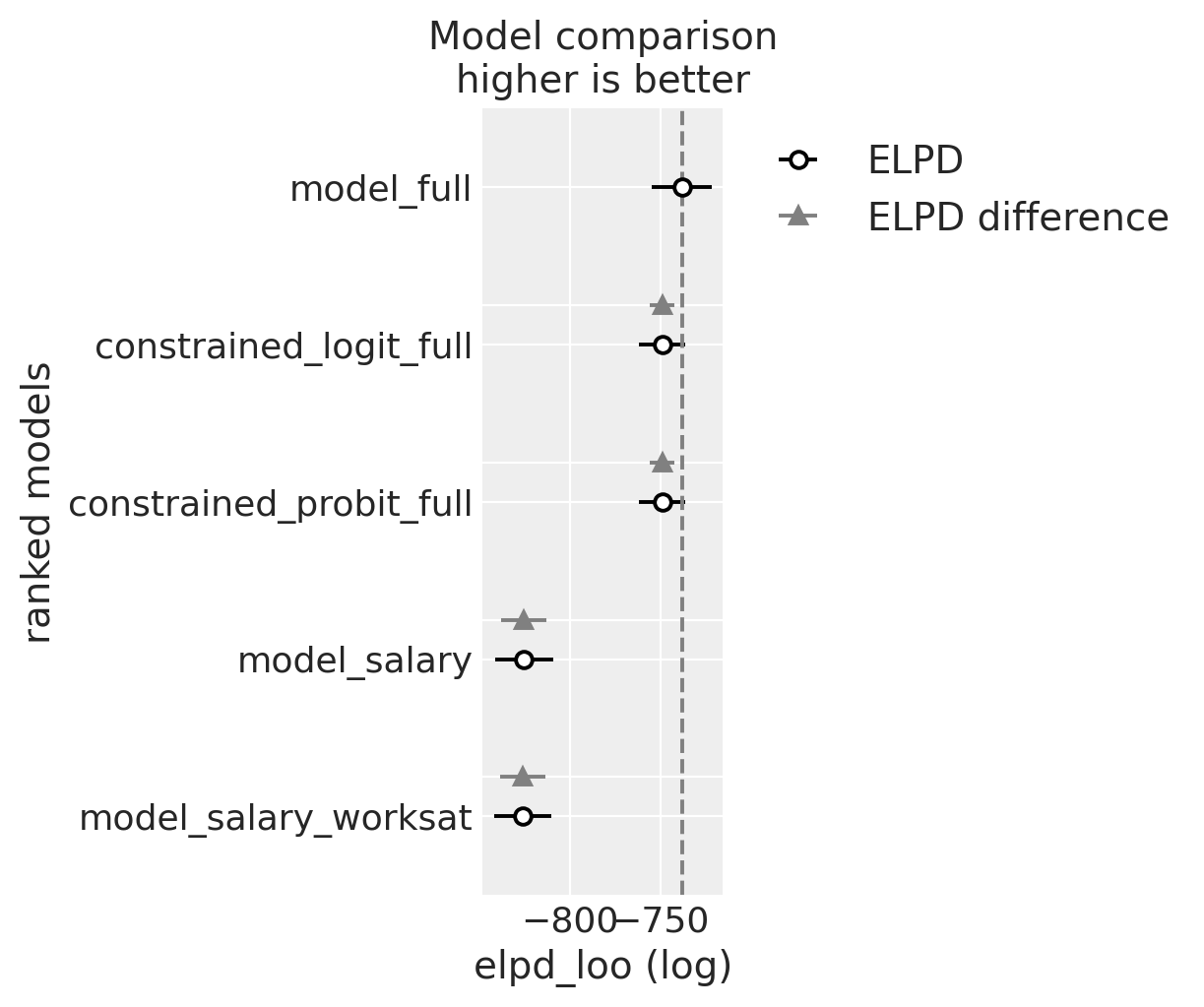 y_5_compare = az.compare({"ordered": idata_ordered, "metric": idata_normal_metric}, var_name="y_5")