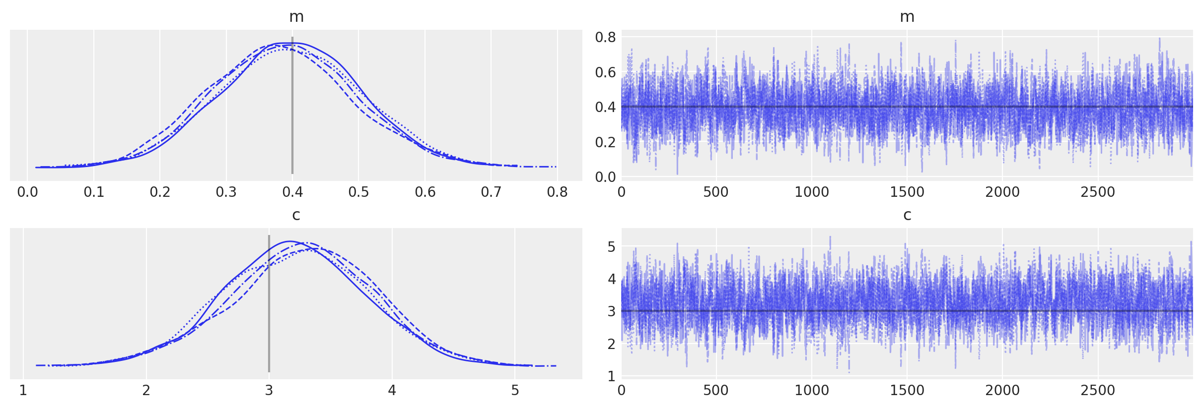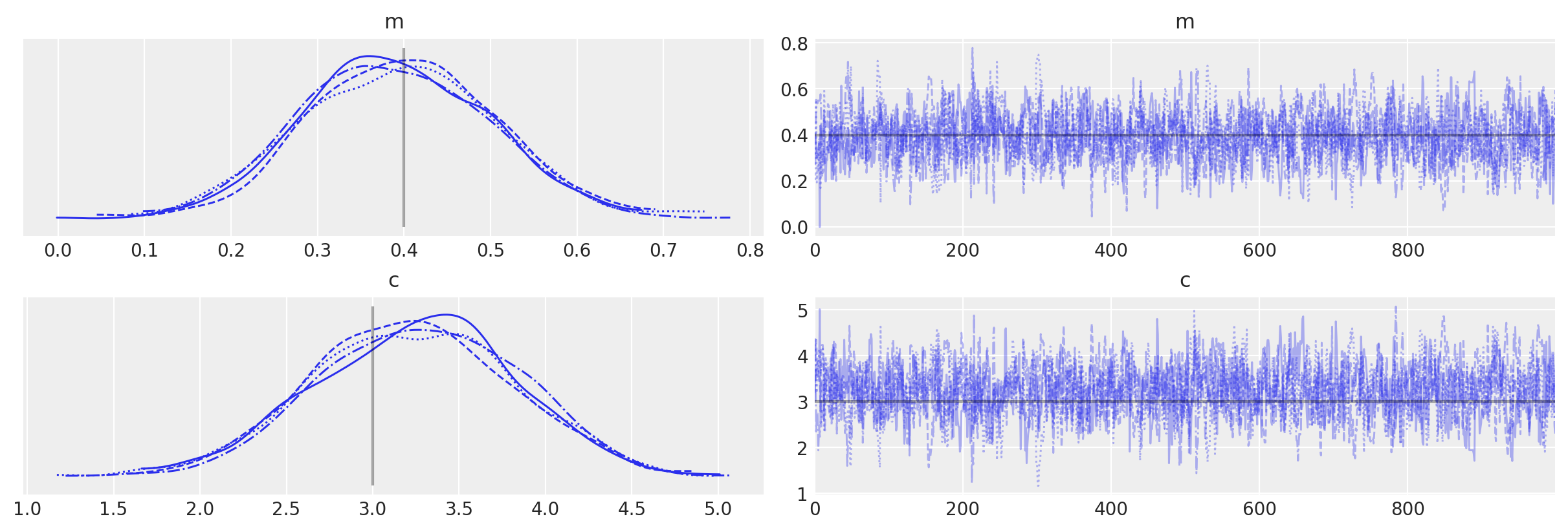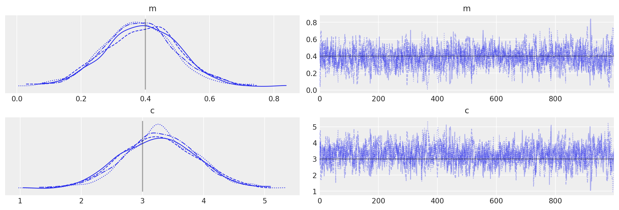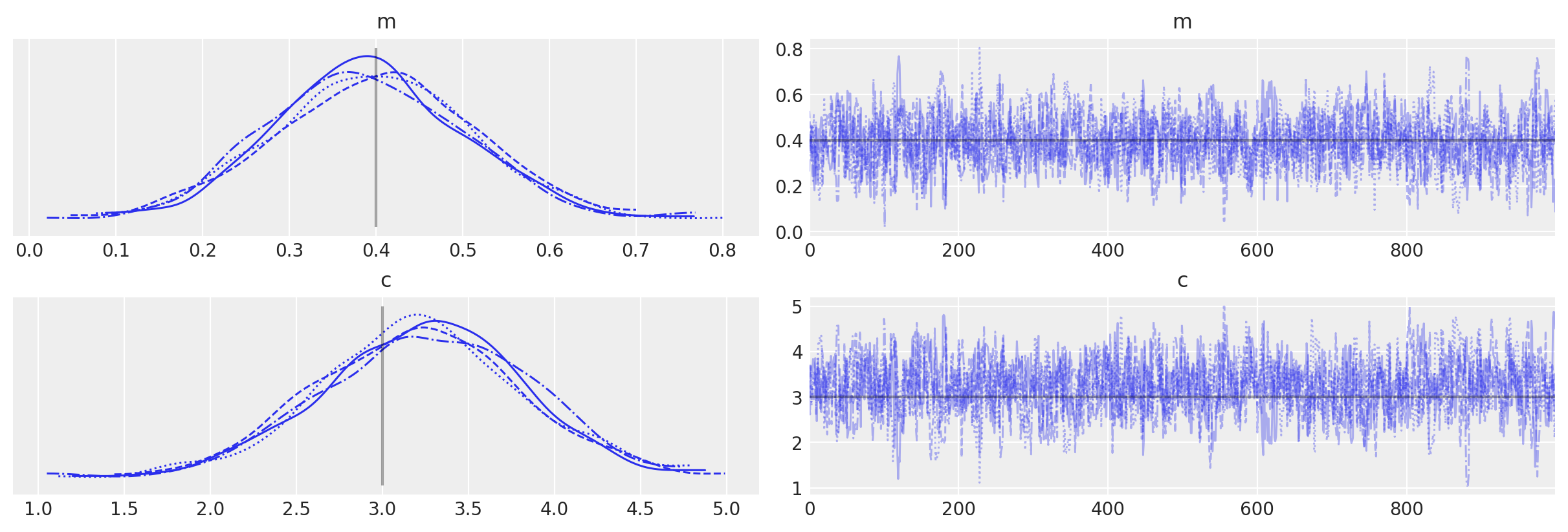 az.plot_trace(idata_pure, lines=[("m", {}, mtrue), ("c", {}, ctrue)]);