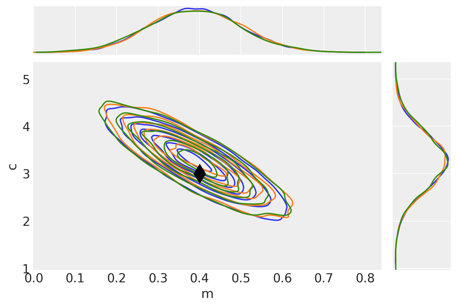 Finally, just to check things actually worked as we might expect, let’s do the same thing purely using PyMC distributions (because in this simple example we can!)