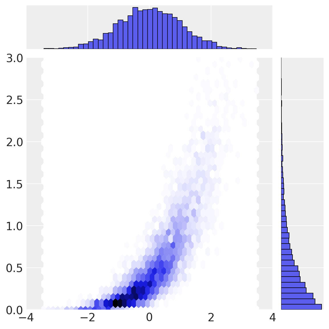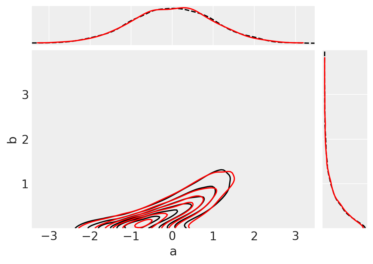 This is where copulas come in. These allow you do describe a complex distribution \(P(a, b)\) with correlational structure by a simple multivariate distribution (such as a Multivariate Gaussian), two marginal distributions, and some transformations. For a very accessible introduction to copulas, we recommend reading through this blog post by Thomas Wiecki.